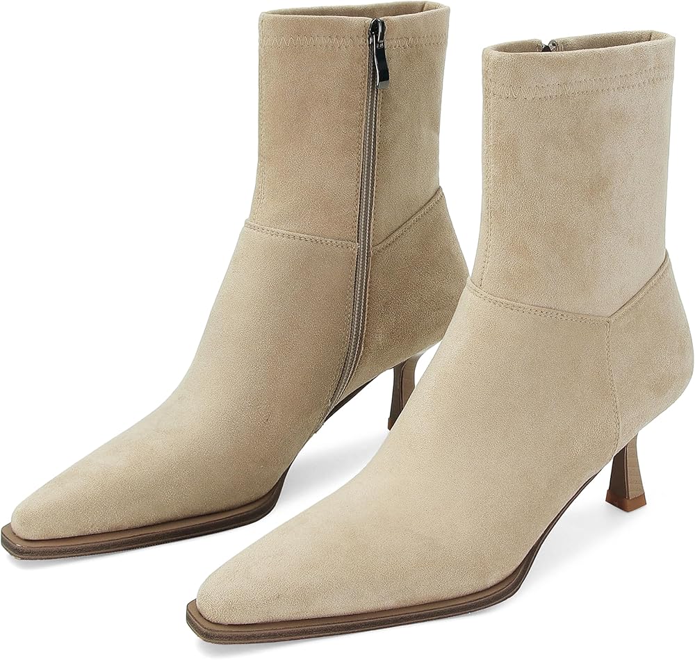 Elegant ankle boots featuring a sophisticated square pointed toe and sleek kitten heel for a modern, feminine silhouette. Step into sophisticated style with these kitten heel ankle booties.