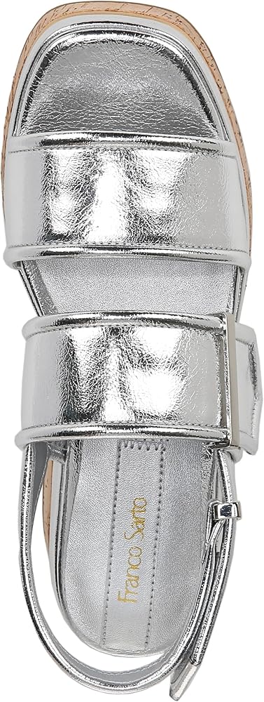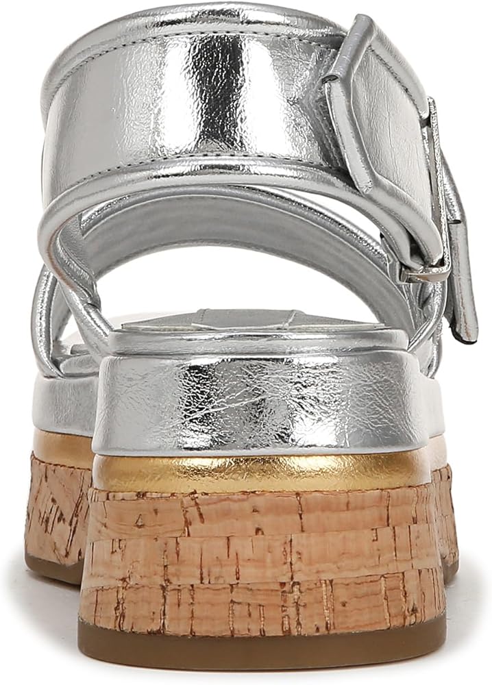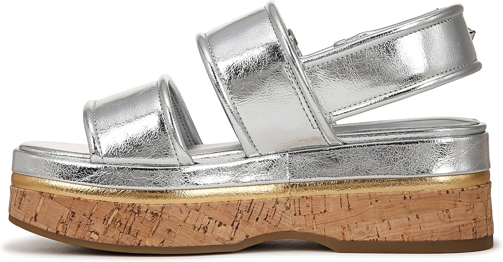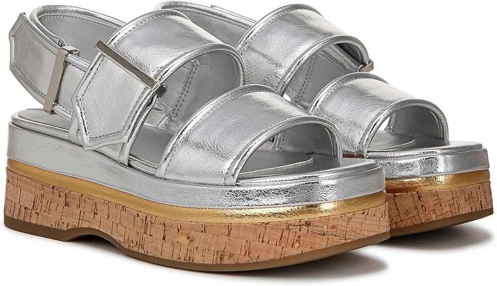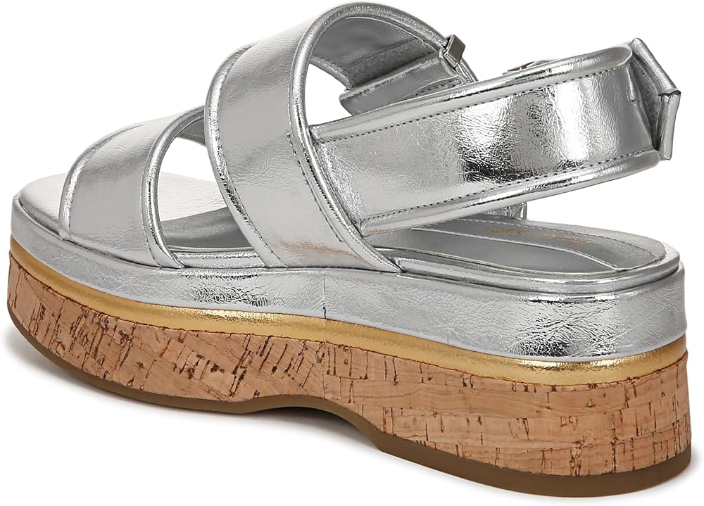 These bold platform sandals, with their array of colors and contrasting stripes, instantly elevate any outfit. Faux leather upper. Slingback with adjustable hook and loop closures. Square toe. 2.1 inch platform.