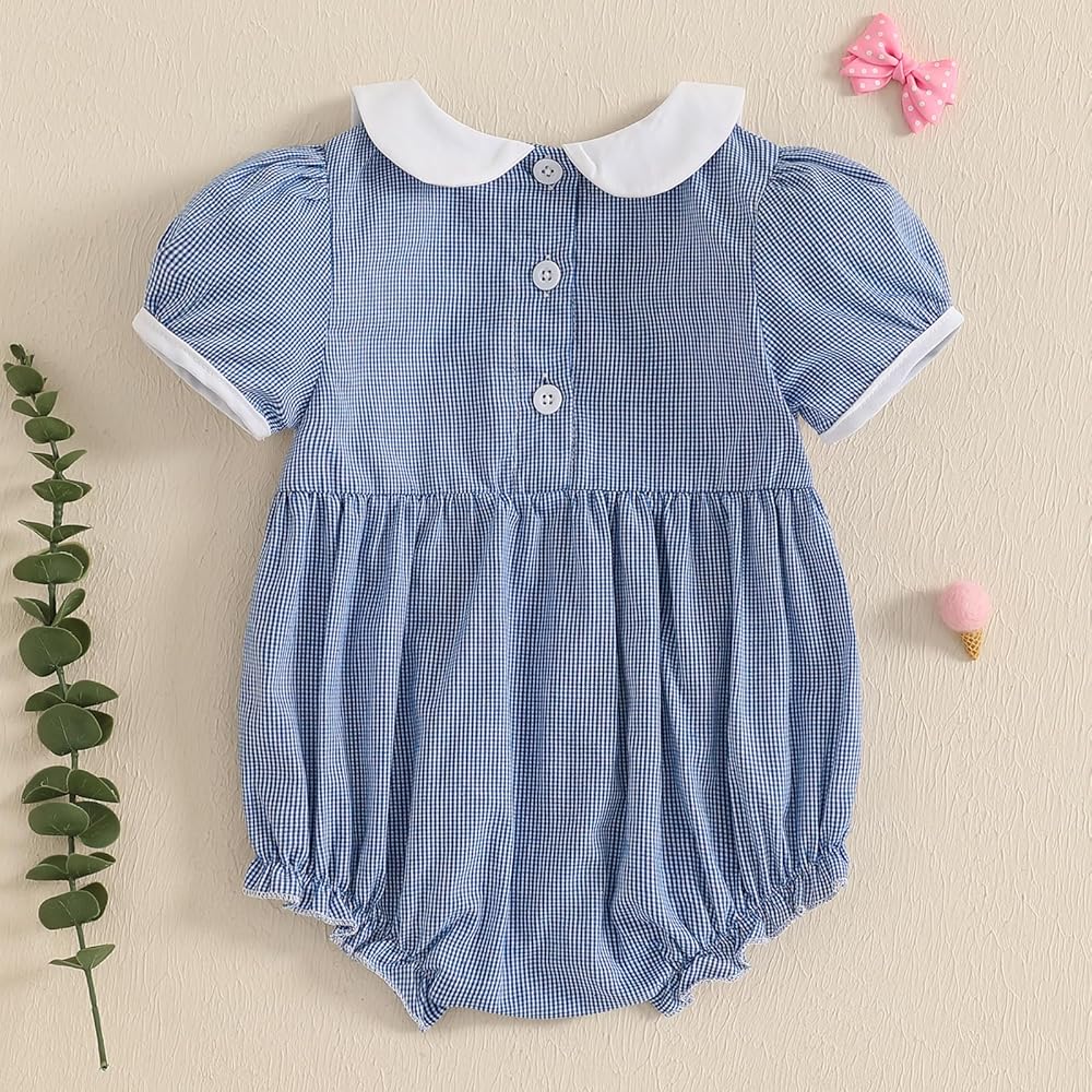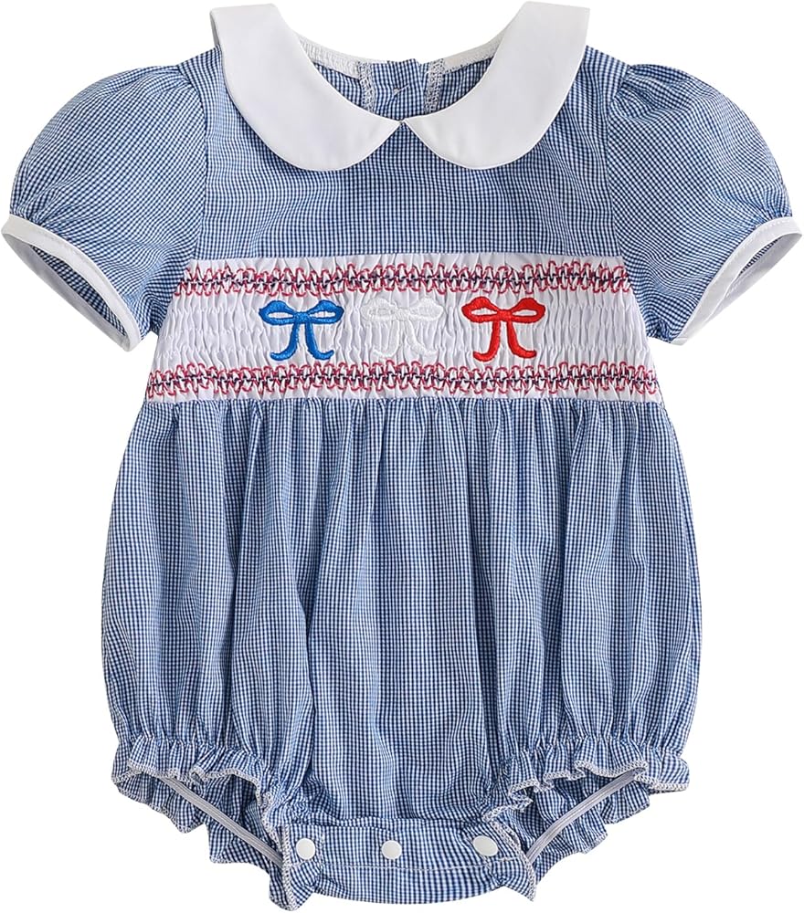 Design:Smocked baby girl bubble romper,newborn girl summer outfit,cute baby girl clothes,boho baby girl clothes,vintage baby girl romper,baby girl bow outfit,puff short sleeve,peter pan collar,doll collar,bow embroidered,bow/floral/heart and other cute prints,the snap closures at the bottom make diaper changes a breeze,cute baby girl romper makes baby girls fashionable and lovely