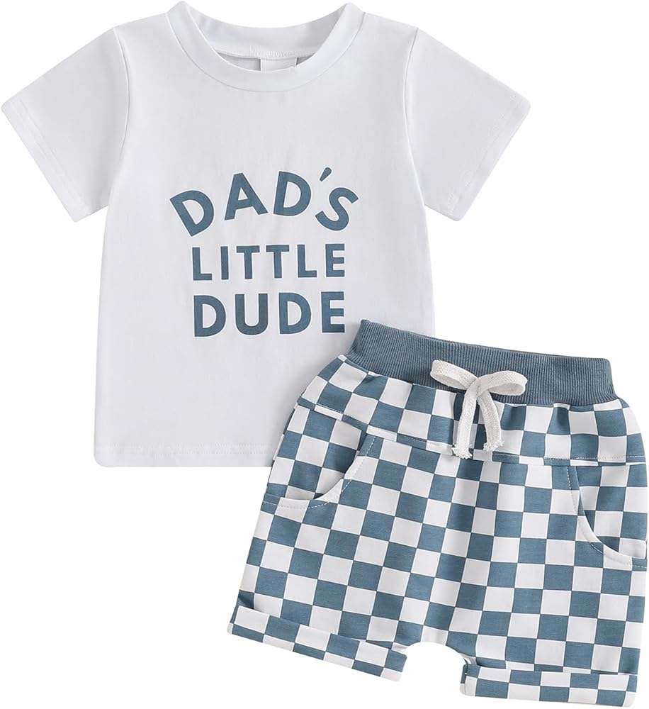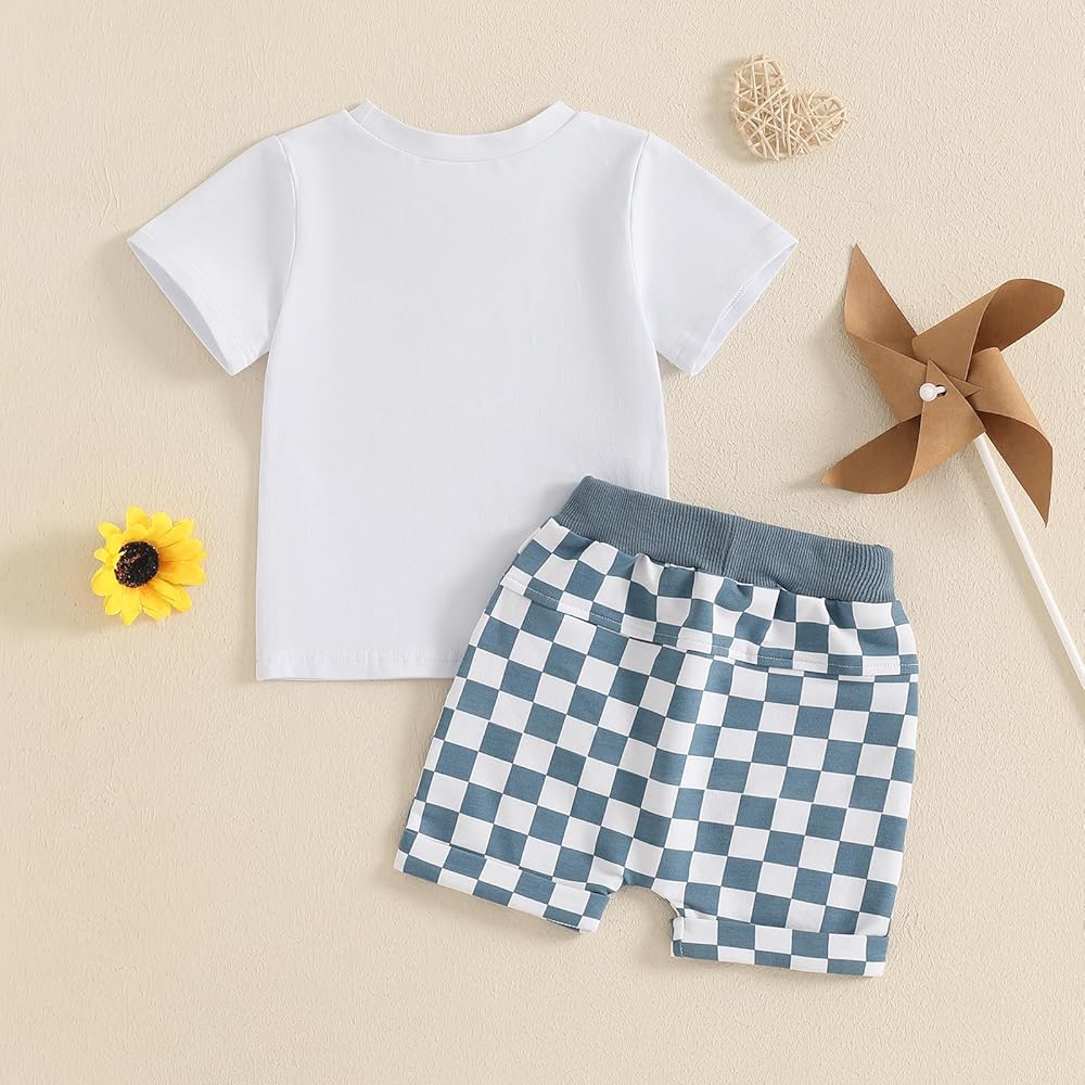 Baby Boys Summer Outfits Letter Print Short Sleeves T-Shirt and Elastic Checkerboard Print Shorts Set