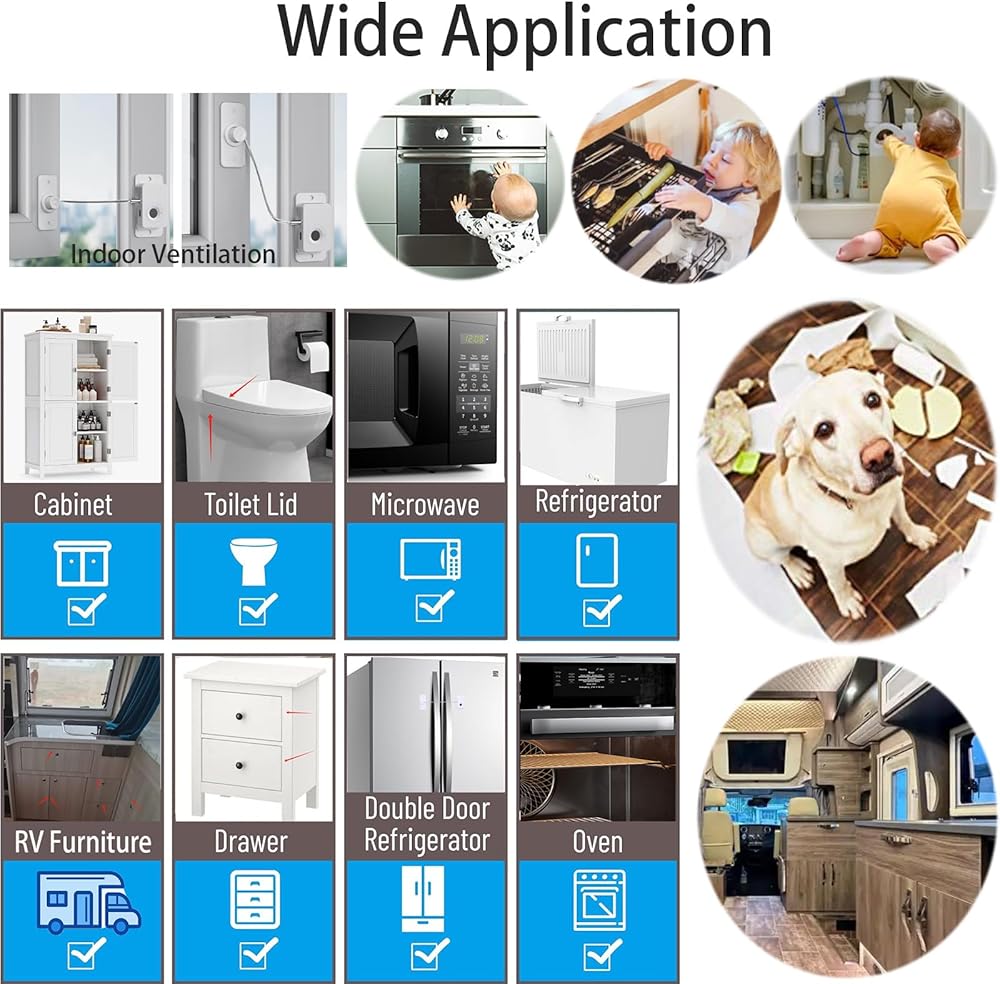 MULTI USE IN DOZENS PLACE: The lock is compatible with most home furniture like cabinet door, drawers, refrigerators, certain toilet lids, certain trash can, closets, wardrobe, microwave, dishwasher, cupboard, oven, freezer. More details in ASIN pictures. It would be necessary when you are in travel, hotel, RV, camper van, or meet the refrigerator door has problem in closing tightly. You also can make it as the window lock to customize window opening distance and indoor ventilation limit