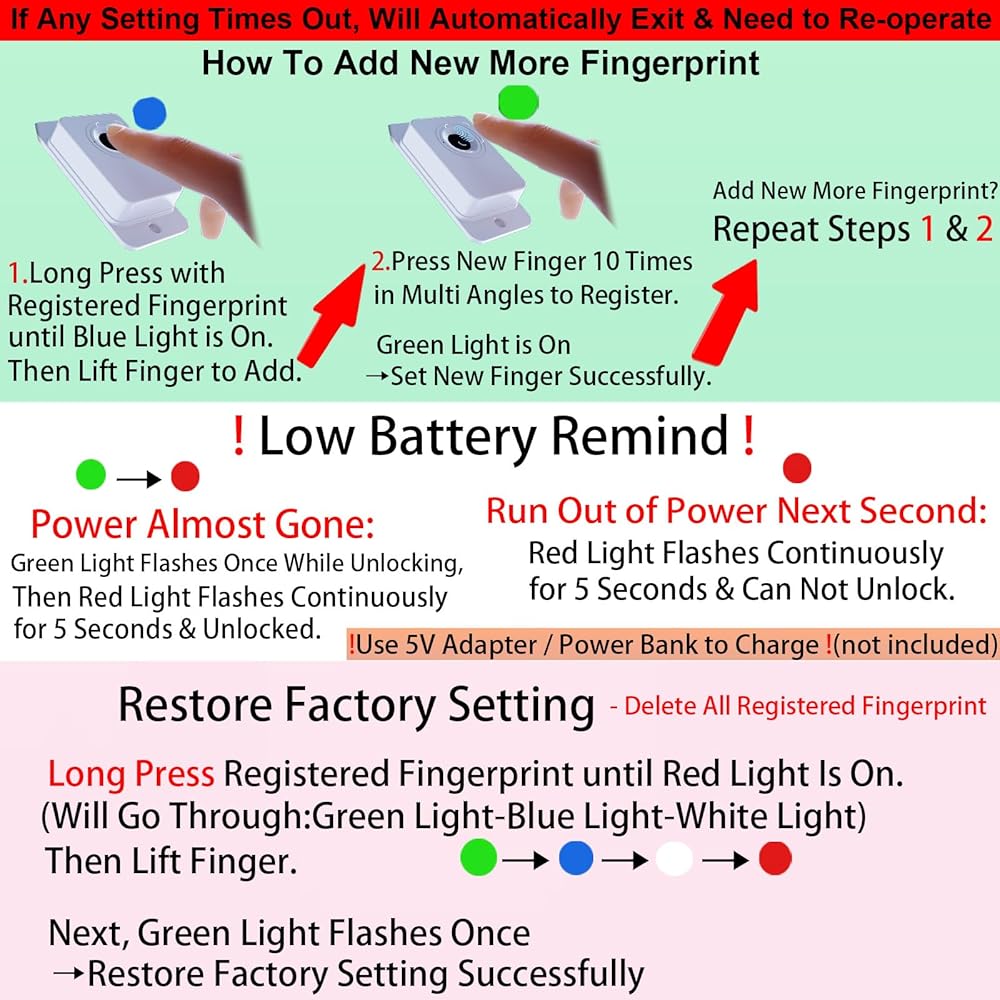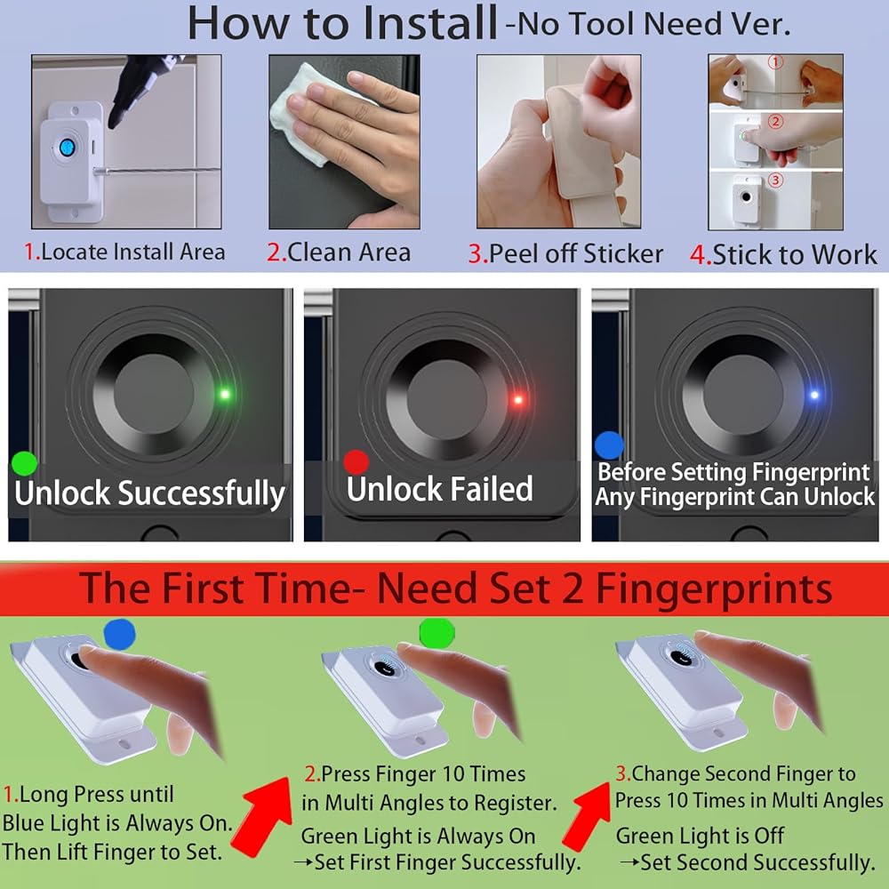 CHILDPROOF & PETPROOF: When your little ones start taking their first steps, it's time to make a safe environment for them. Offer reliable security when curious babies or pets is exploring. Protect them from unwanted items. For example, prevent them from opening cabinets, ovens, others or eating forbidden by parents; even they accidentally lock themselves in there. Just follow the guide to set the fingerprint, move the finger at multiple angles when entering the fingerprints. Lock the danger!