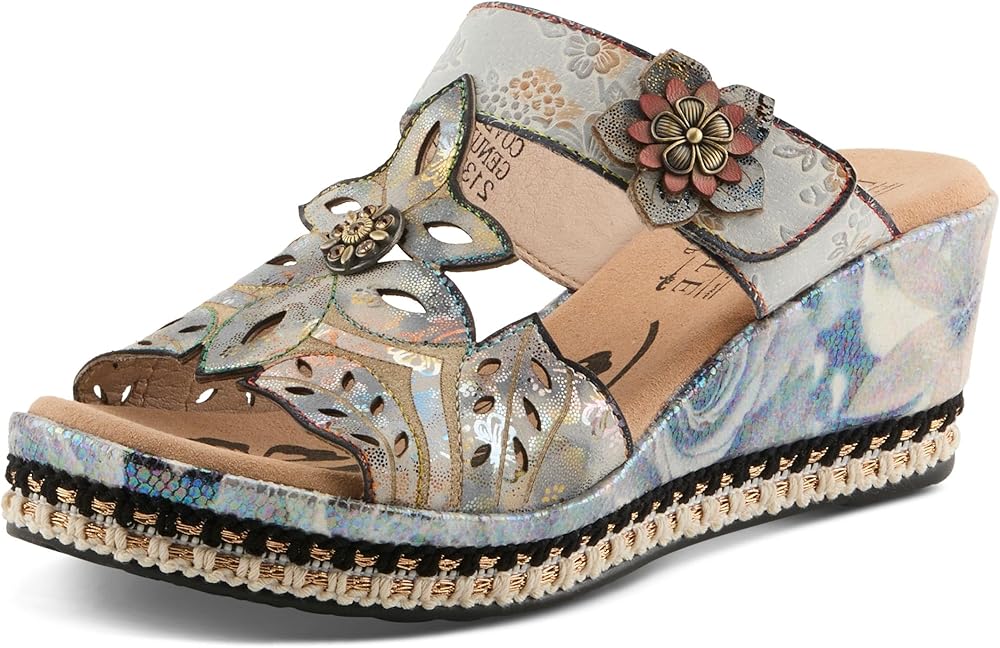 This statement sandal features a printed metallic leather upper with a laser-cut floral design that gracefully drapes across the foot. Embossed, hand-painted flowers adorn the adjustable ankle strap, while tonal prints wrap elegantly around the wedge.