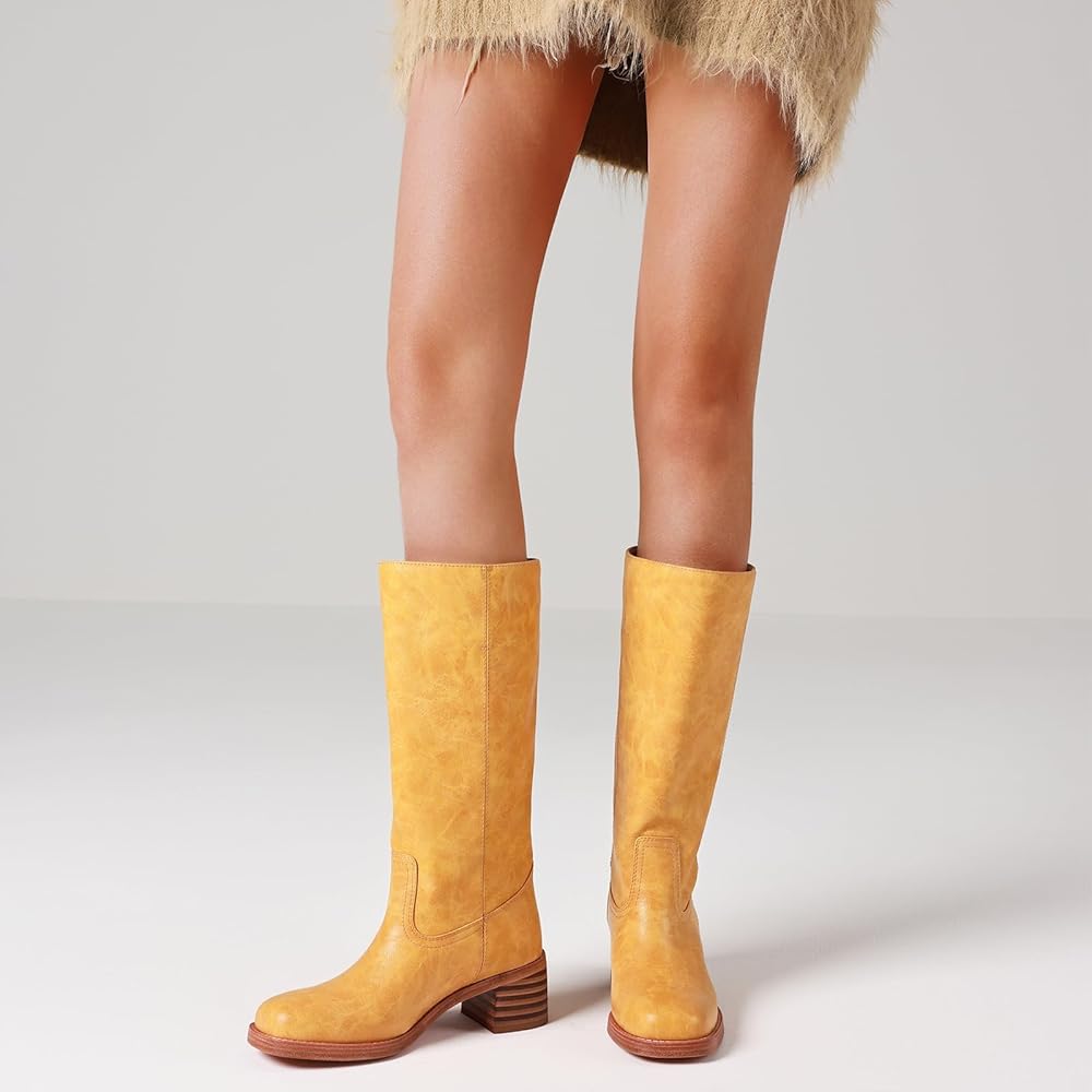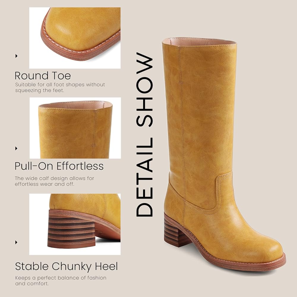 - Design: These riding boots are designed with pull on , wide calf, leather, square toe, chunky heels.