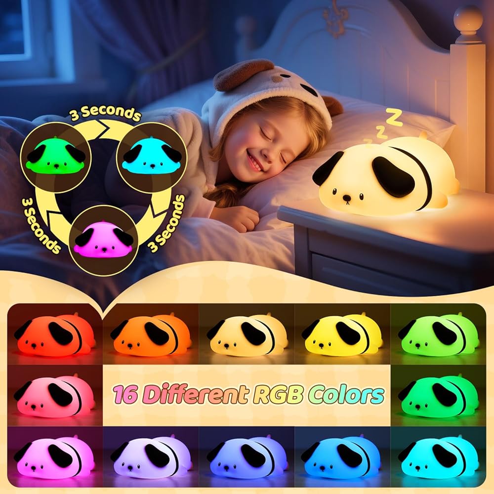 🌈【16 Colors Breathing Baby Night Light for Kids】The toddler night light for kids has up to 16 colors, including the red/orange/yellow/green/blue/purple.The color of the toddler night light kids can be changed gradually to create a captivating effect. In gradient mode, the kids night light night lamp switches between 16 colors approximately every 3 seconds. It's like a dog breathing with a nightlight. Red light pattern (630nm wavelength) of the baby's night light kids promotes melatonin secretion. The baby night light for kids also has a super bright warm light mode whether it's for reading a bedtime story or a nighttime parenting task, this dog lamp & squishy lamp & kids lamp is perfect.