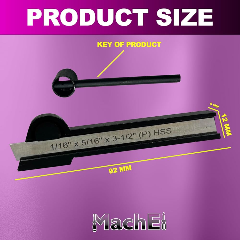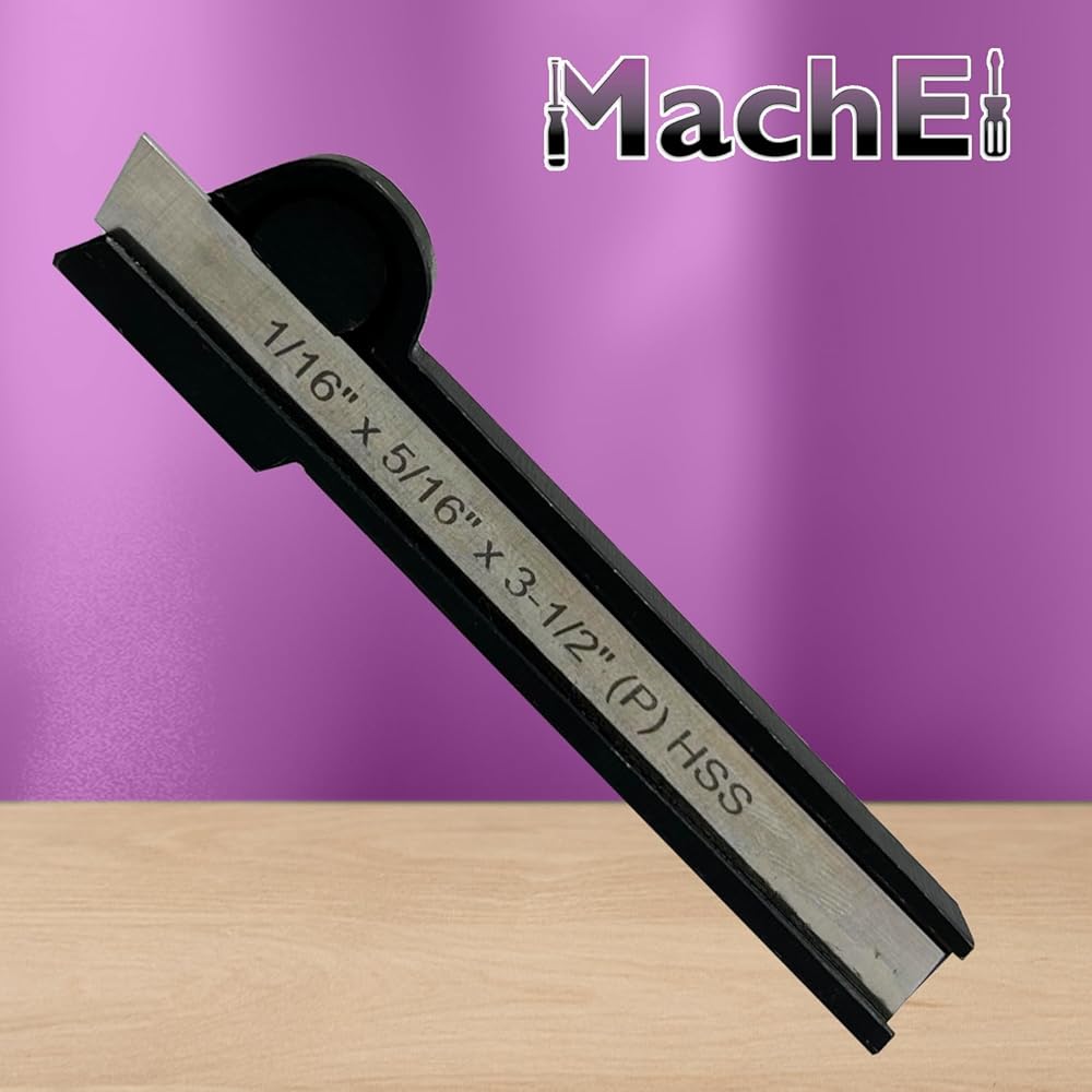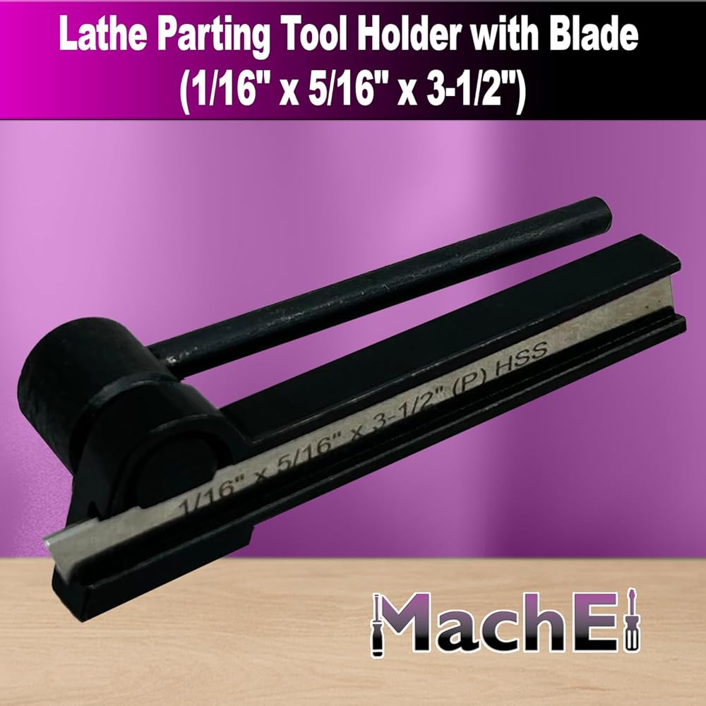 The MachEl Lathe Parting Tool Holder with Blade is a reliable tool for precise parting and cutting tasks on lathes. The tool holder is designed to securely hold a 1/16" x 5/16" x 3-1/2" HSS blade, providing excellent performance for clean, accurate cuts. This compact and sturdy tool ensures stability during parting operations, making it ideal for use with a variety of materials including metal, plastic, and wood. The tool is built for durability, offering long-lasting reliability even under frequent use. Whether for professional machinists or DIY enthusiasts, this parting tool holder is a must-have for efficient lathe work.