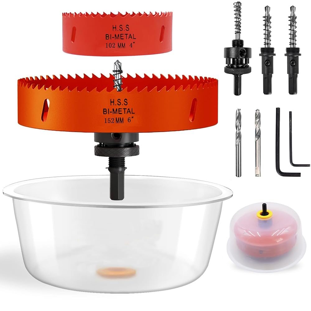 Our Hole Saw for Recessed Lighting included:1 pc 6 1/8 inch(155mm)hole saw,1 pc 4 1/8 inch(105mm)hole saw, 1 pc matching dust bowl, 3 pc arbor, 2 pc replacement drill bit, 2 pc hex key.This silicone dust bowl for hole saw can effectively blocks most dust, preventing it from staining floors or accidentally injuring eyes. The wrinkle-free design makes the dust bowl easy to rinse clean and allows for continuous use, making it a dust cover designed for ceiling drywall or plasterboard drilling