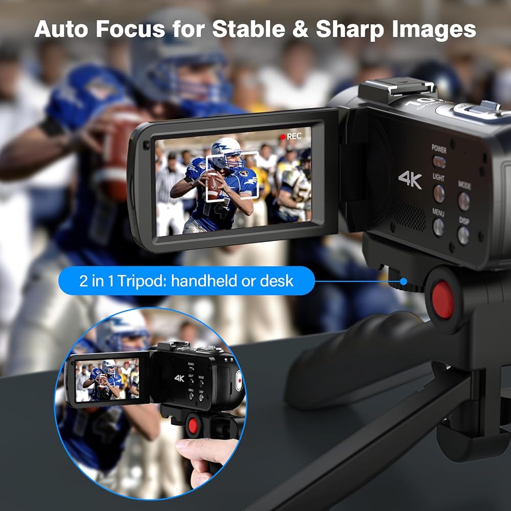 【Fully Auto Focus, Effective for Close-ups】The camcorder features rapid auto-focus,capturing clear shots of objects from 5 cm to 50 cm—surpassing the typical challenge of cameras struggling to focus within 1 meter. The 2-in-1 tripod serves as a handle or tabletop tripod,ensuring stability and versatility. Additionally,the vlogging camera is equipped with high-brightness LED white light to enhance lighting in low-light environments.