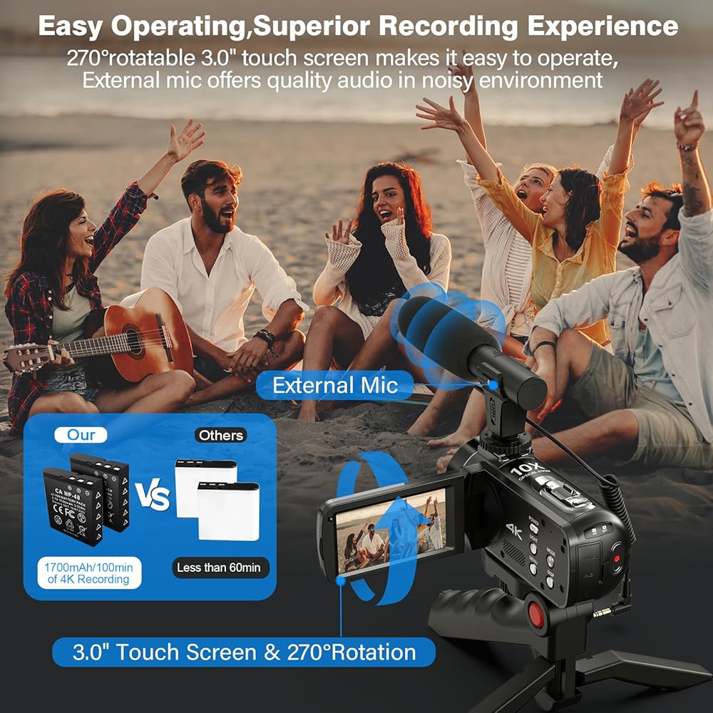 【Easy Operating,Superior Recording】The camcorder has a 3-inch 270° rotatable IPS touch screen for easy operation and shooting from multiple angles. With an external microphone,4k video camera effectively improves audio quality. The 4K camcorder includes two high-capacity batteries,each providing over 100 minutes of 4K video recording,surpassing ordinary NP-40 batteries lasting less than 60 minutes.