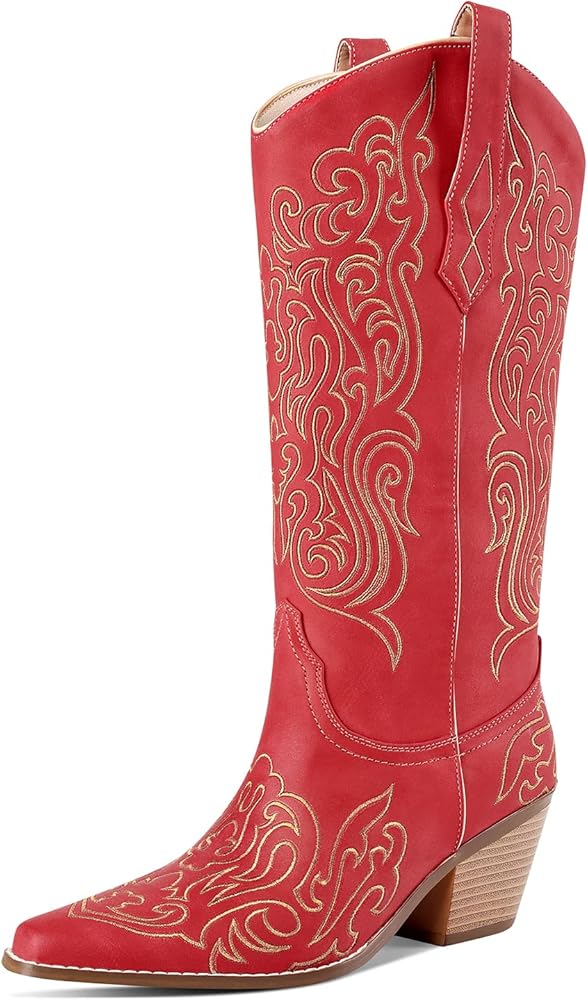 LOCERICH Women Knee High Boots Cowgirl Boots Cowboy Tall Boots Western Wide Calf Ladies Low Chunky Heel Snip Toe Comfortable Dress Boot with Embroidered