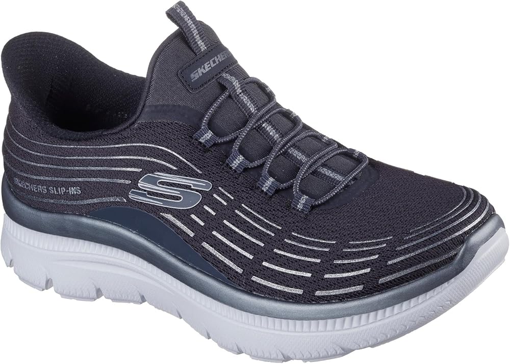 Pick up the pace with increased ease-of-wear and superior comfort wearing Skechers Slip-ins: Summits-Plus. Designed with our exclusive Heel Pillow, this vegan style features a mesh bungee glitter 3d print and a cushioned Skechers Air-Cooled Memory Foam comfort insole.