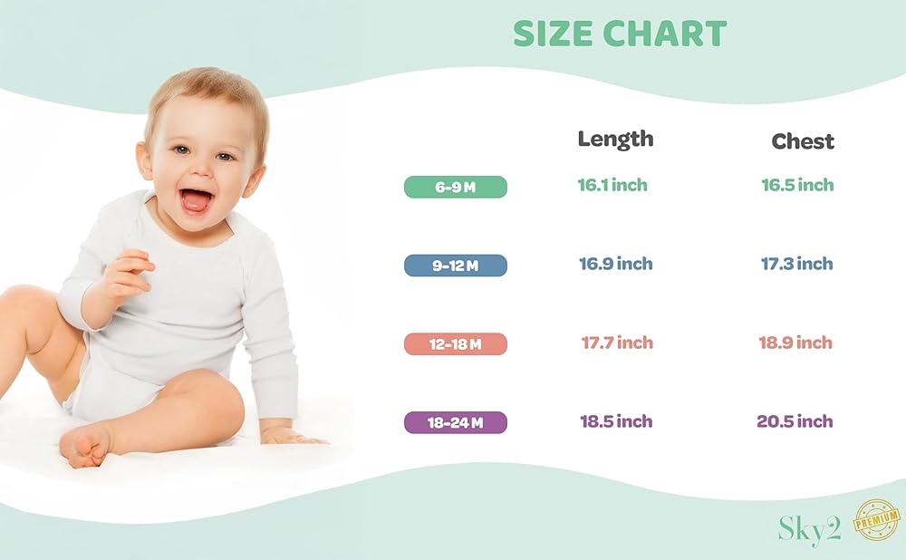 Traditional Sizing - This bodysuit is available in classic sizes, including 6-9 months, 9-12 months, 12-18 months, and 18-24 months.
