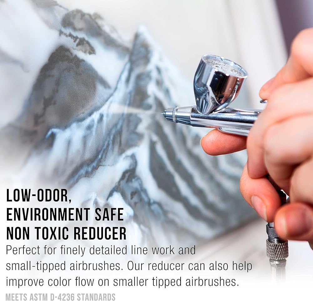 We recommend thinning with airbrush reducer & extender base when doing fine-line detailed work with a small tipped airbrush.