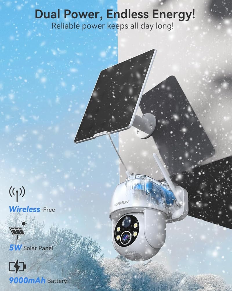 MUBVIEW 5W Solar Security Cameras Wireless Outdoor, 360° PTZ Battery Powered Outdoor Camera Plus, 2.4Ghz WiFi Security Camera for Home, 2K, Color Night Vision, Motion Detection,9000 mAh Battery