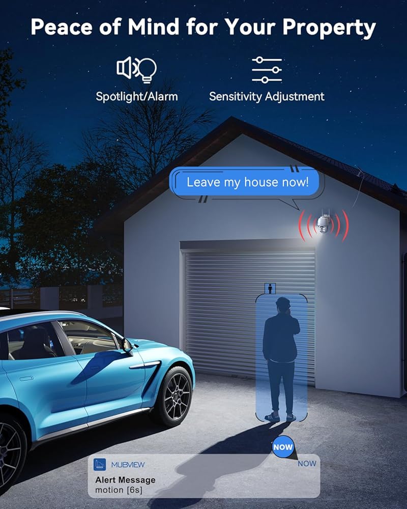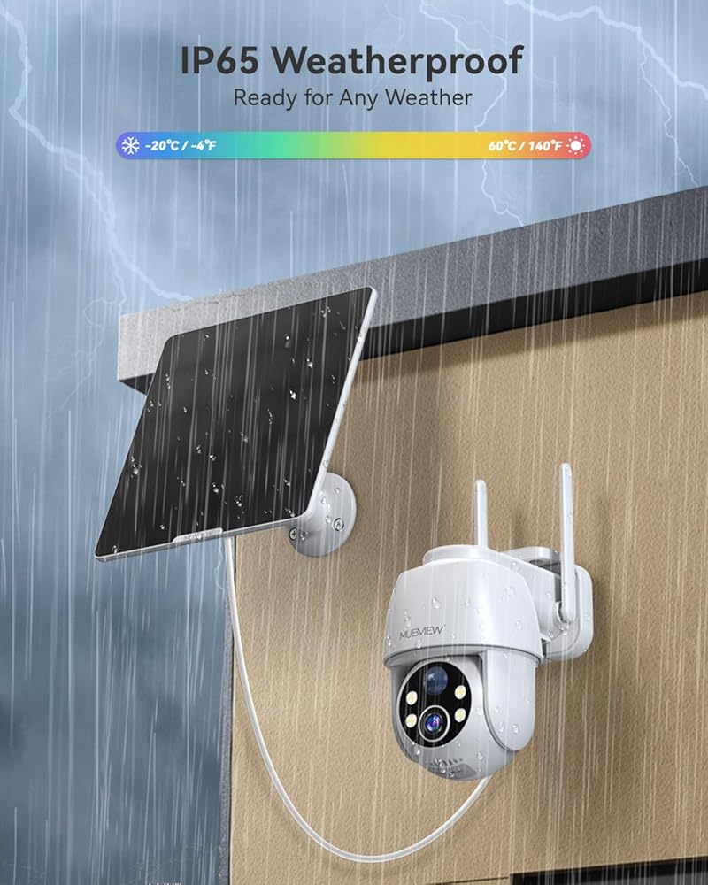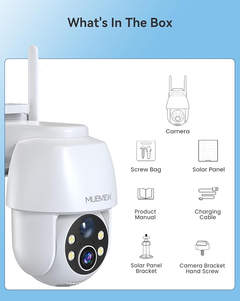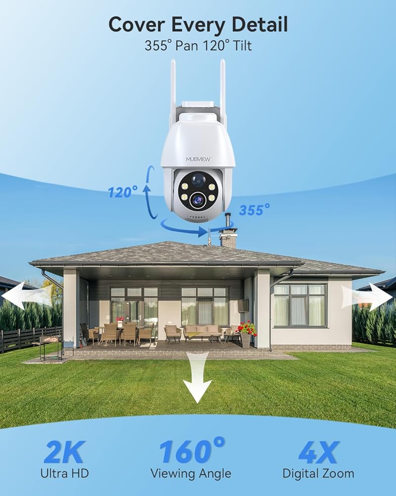 【3MP/2K FHD Image & All-Round Security】Experience 360°PTZ (355°pan and 120°tilt) coverage using the 120°wide-angle 2K security camera outdoor. The MUBVIEW outdoor camera wireless offers enhanced color night vision up to 55FT, and features 2 spotlights to brighten the area for clear, detailed images, even in total darkness.