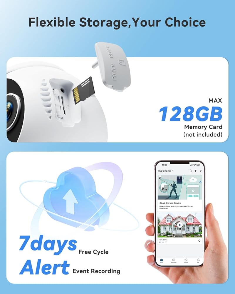 【Flexible Storage & User-friendly APP】The wireless security camera supports memory card (not included) as well as permanent free 7-day looping cloud storage. Utilizing military-grade double encryption to safeguard your privacy. Share the live stream and camera access with friends and family, while managing multiple devices in one APP.