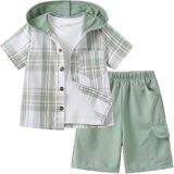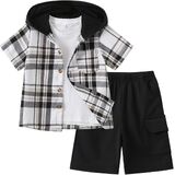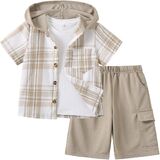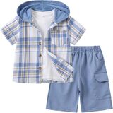 【Package】: 1 x kids' boy short sleeve button down plaid hooded shirt + 1 x knit cargo shorts.