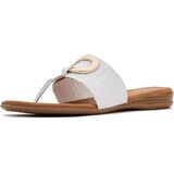 Nixi is a stretch woven flat sandal with thong and metal ornament