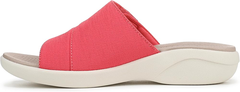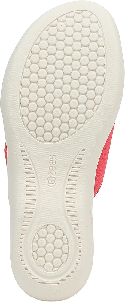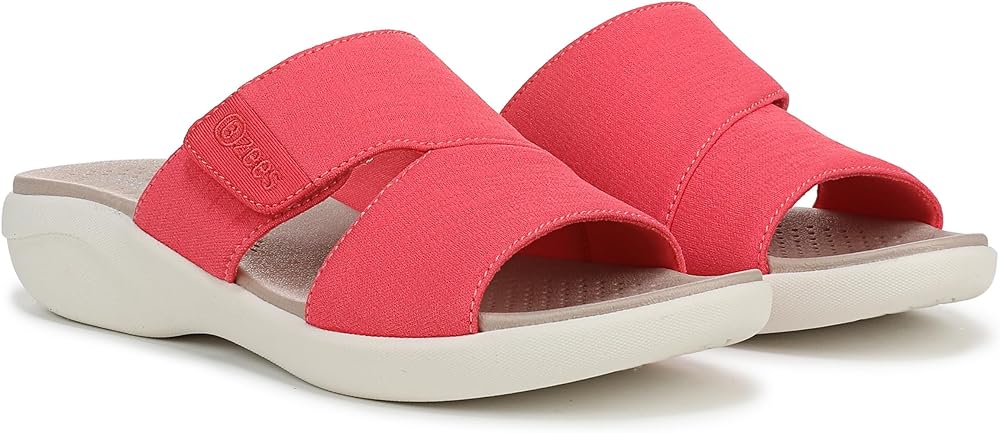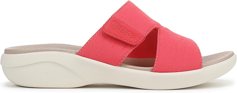 These sporty slides were made for you! Slip on and go in sandals that always fit in your schedule. Stretch fabric or shimmer fabric upper with partially recycled lining and round toe. Slip on fit with adjustable hook-and-loop strap. BZEES Air Step Technology: Designed so you'll feel weightless, energized and free. Ultra Lightweight: Step lightly with a nearly weightless feel. Dynamic Stretch Fabrics: Move freely in shoes with built-in stretch. FreeFoam™ Comfort: Low pressure insoles with maximum foot contact and cushy arch support. SoCush arch support. Odor Control technology. 3/4 inch platform, 1 1/2 inch heel. Get Width It: Countless pairs of Bzees come in wide width shoes for women. Machine Washable: Wash on cold and air dry.