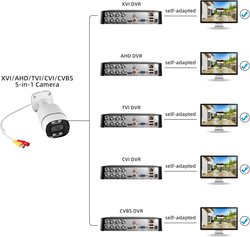 【2MP HD 1080P 5-IN-1 Security Camera】This is 5-in-1 TVI/CVI/AHD/XVI/CVBS bullet camera. It is compatible with 960H,720P,1080P,3MP,5MP,8MP,4K HD-TVI, AHD, CVI, XVI, and CVBS/960H analog DVRs.The default video mode is 960H mode, compatible with all analog DVRs. The 1080P video mode needs to be switched according to your 1080P DVR type.