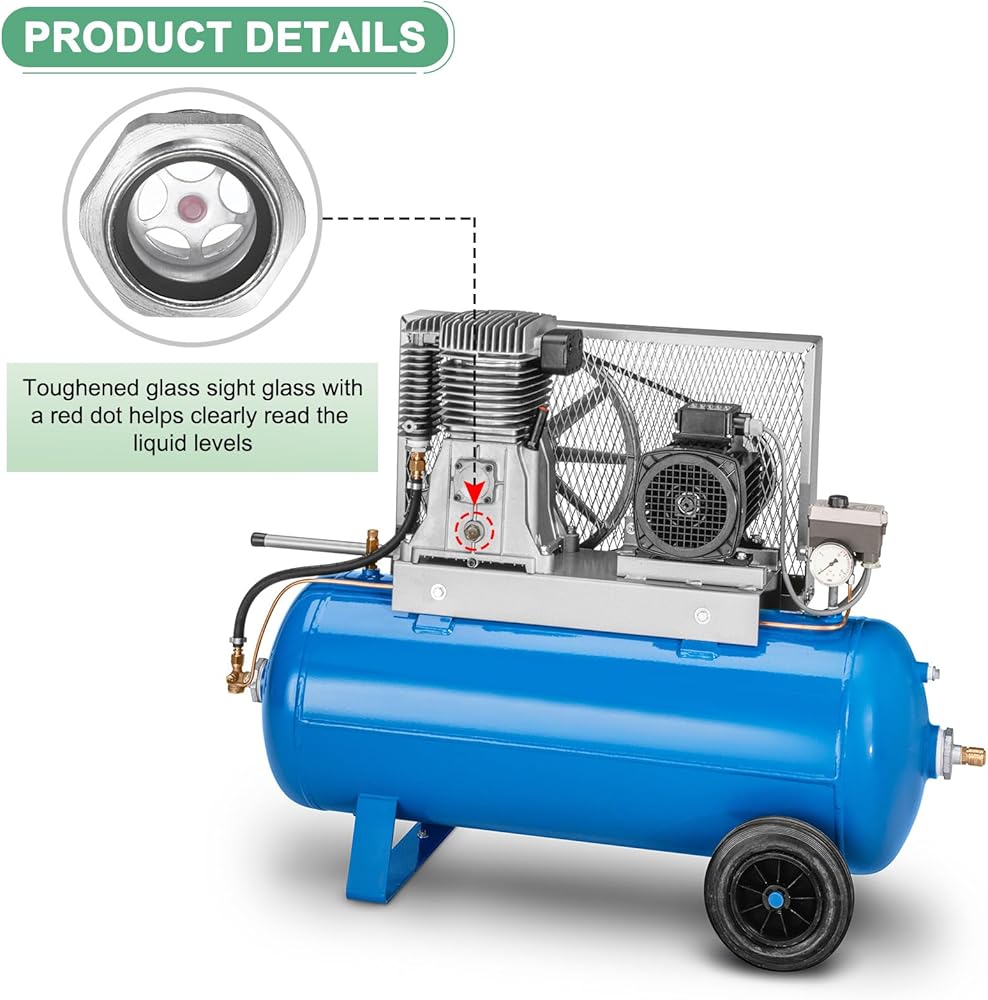 • [Advantage] - Toughened Glass sight glass with a red dot provides clear visibility of liquid levels, facilitating observation of oil color, transparency, and condition for timely maintenance and refilling.