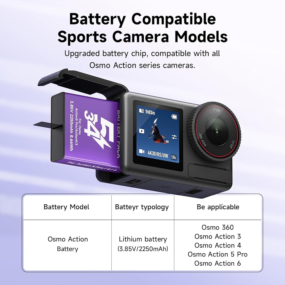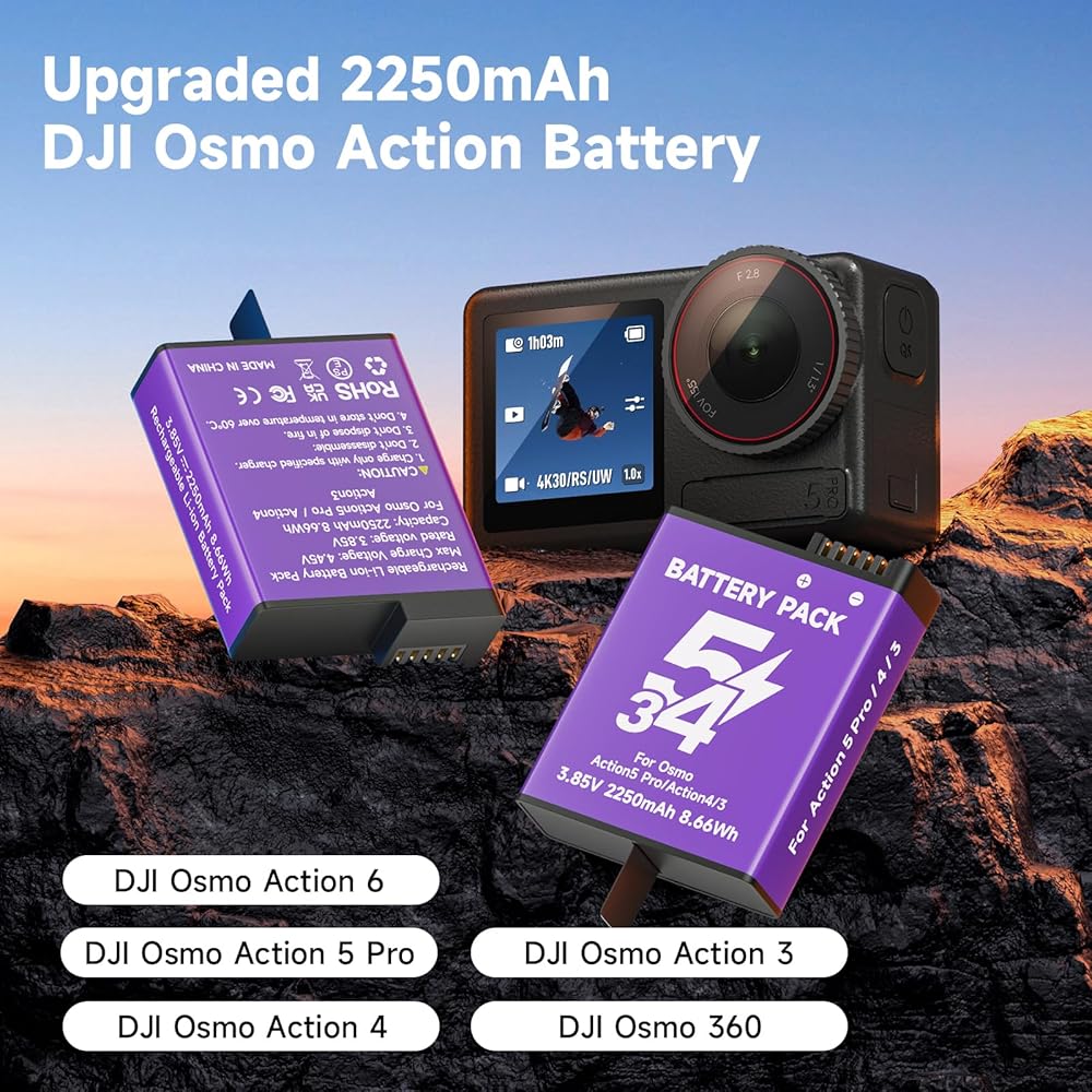 2250mAh large Capacity provides a long lasting of photo shooting and video recording for your Osmo Action 5 Pro, Osmo Action 4 and Action 3 Camera. About 2000 recharge cycles over the life of each battery