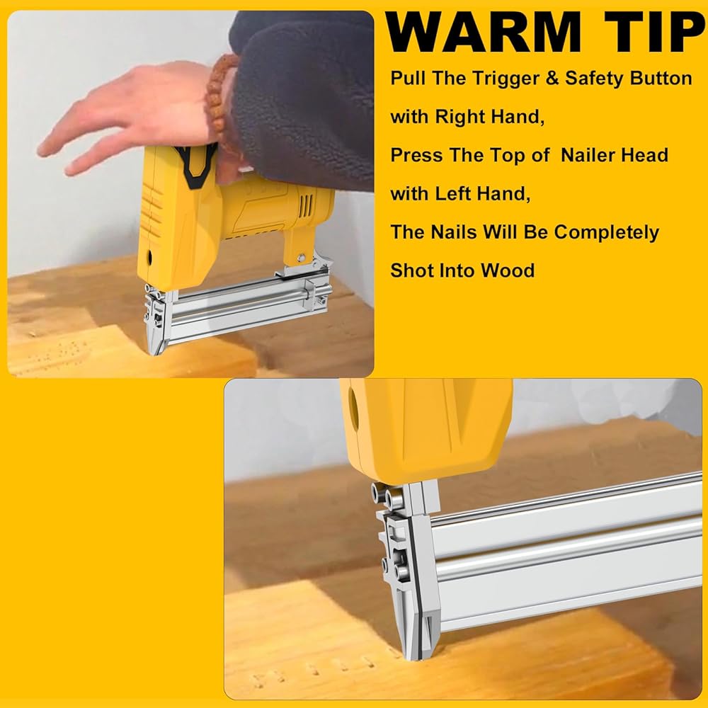 Safety Self-Locking Switch : The battery operated nail gun has a self-locking switch close to the trigger to prevent firing nails accidentally. You can pull the trigger and self-locking switch together to launch the nails or staples simply and safely.