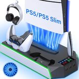 PS5 / PS5 Slim Cooling Station with Controller Charging Station - LED Light Cooling Stand for Playstation 5 Slim Disc/Digital Console, Accessories Incl RGB Light/Cooler Fan/3 USB Hubs/Headset Holder