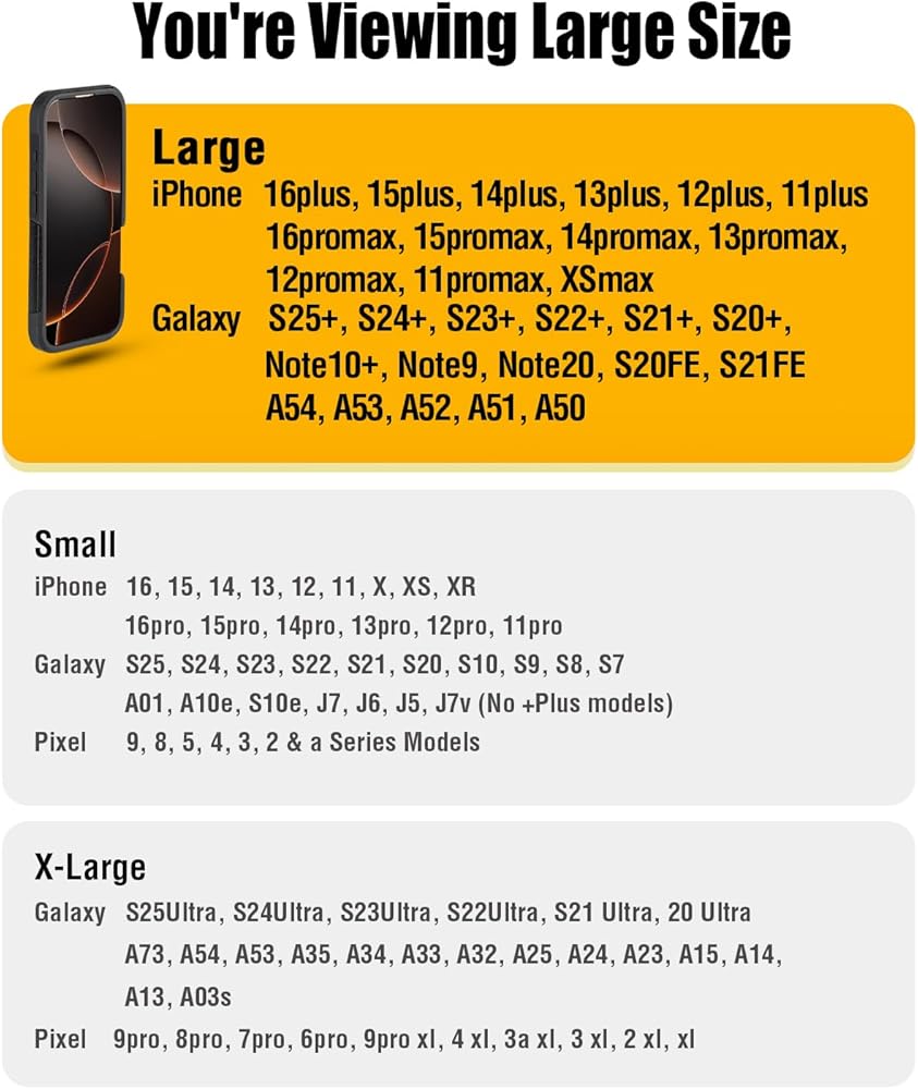 This phone holster is designed for large cell phones with protective case on: iPhone 16 plus, 16 pro max, 15 Plus, 15 Pro Max, 14 Plus, iPhone 14 Pro Max, iPhone 13 pro max, 12 pro max, 11 pro max, Xs max, 8 Plus, Samsung Galaxy s23+ plus, s22+ plus, s21 plus, s20 plus, A54, A53, A52,Google Pixel 4 XL and more.