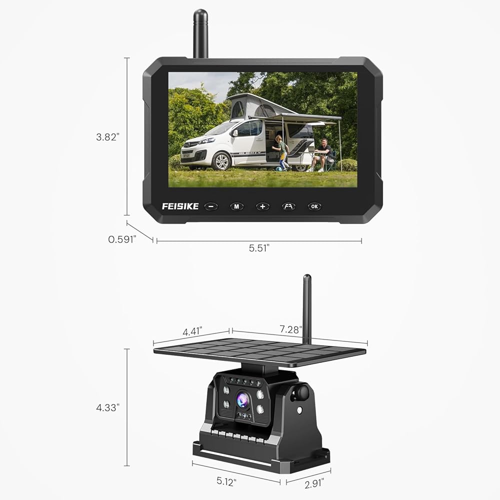 Solar-Powered & Rechargeable Battery for Long Lasting -- Equipped with 9600mAh rechargeable battery and 5W solar panel, rv camera system wireless ensures sufficient charge in cloudy or sunny days(25 hours of use on a full charge). Turn off the screen, the camera will enter the sleep state, extending the battery life greatly and reducing the energy consumption.