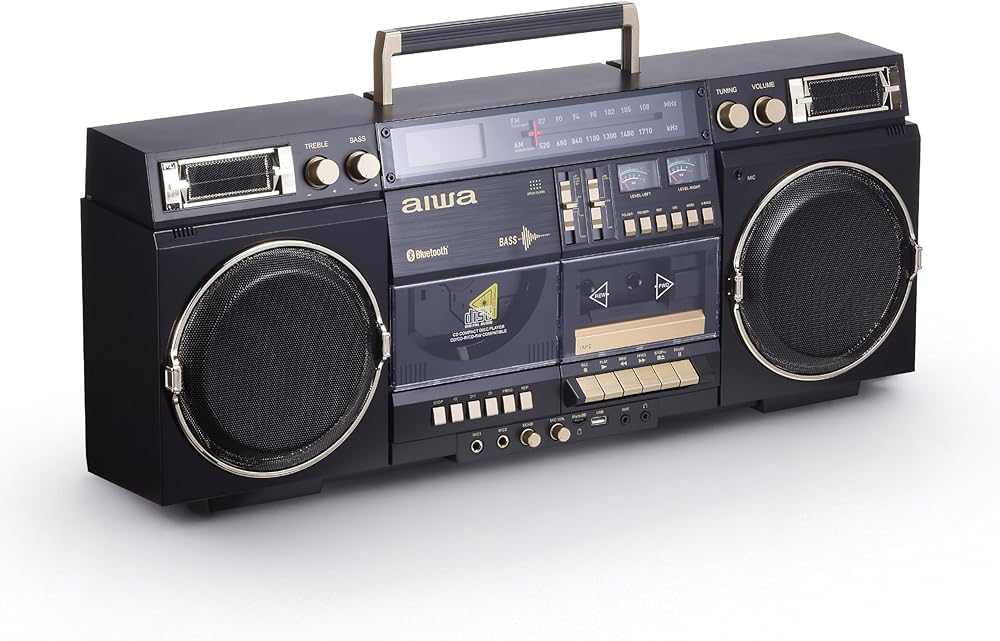 aiwa Retro Boombox BackTrack CD Player with Cassette Recording, Bluetooth 5.0, FM/AM Radio, USB/SD/AUX Inputs, VU Meters, LCD Display, Dual 40W Speakers (Black and Gold)