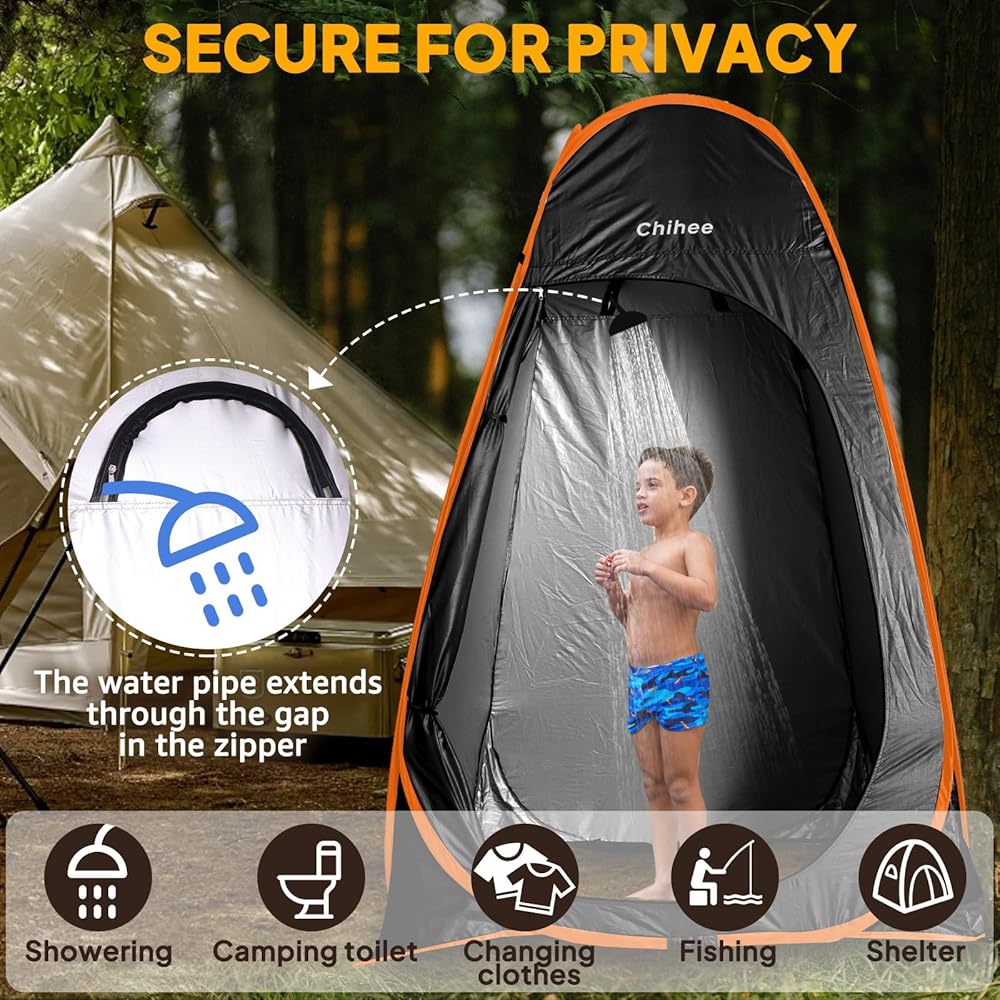 Versatile and Practical Design.The tent includes a small opening at the back top, allowing for easy attachment of a water hose.Making it perfect for use as a portable shower shelter when you're camping, hiking, or at the beach. Including a floor to keep dirt, sand, and water out, which is especially useful when changing clothes or showering in outdoor environments.Bulit-in hook and storage pocket inside for changing or showering, to hang items like towels, clothes, or toiletries.
