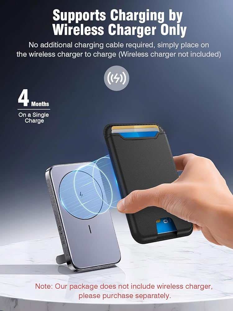 【Rechargeable & Long Battery Life】This magnetic card wallet with find my function does not require charging cable. It is charged wirelessly, so please make sure you have a wireless charger before purchasing. The smart card built into the Magsafe wallet lasts up to 4 months on a single charge, so you don't have to worry about recharging it too often.