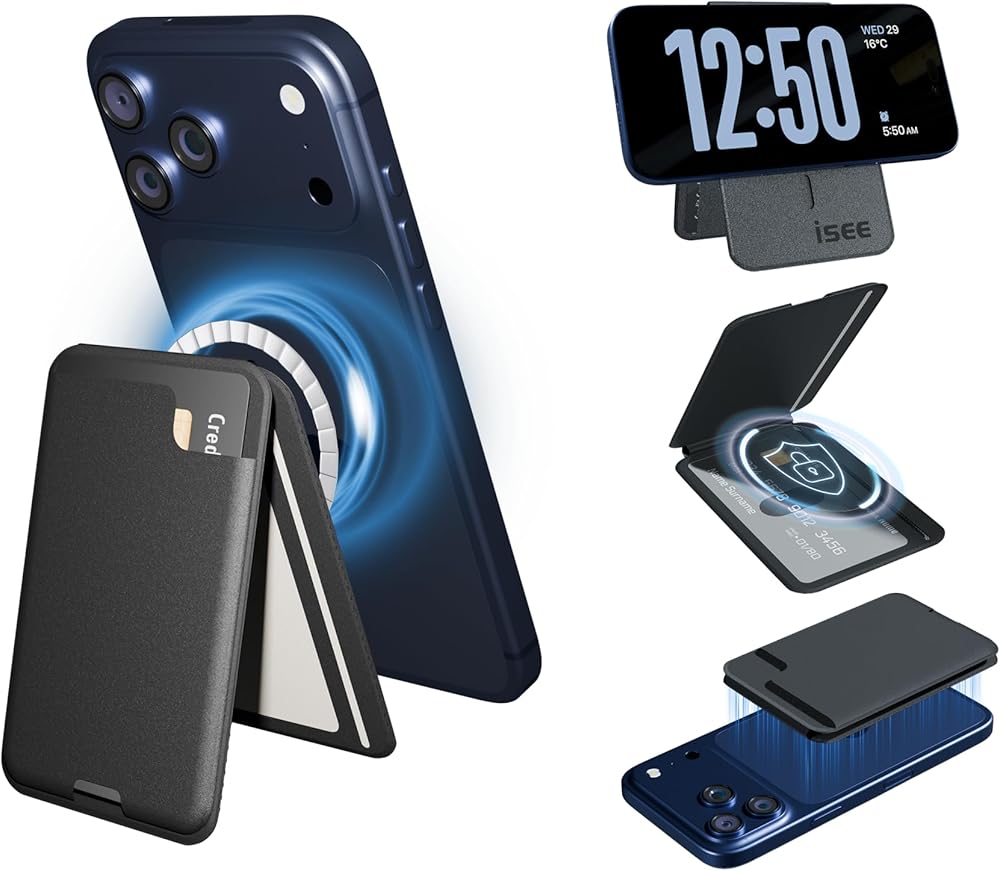 isee MagSafe Wallet with Stand for iPhone 17/16/15/14/13/12, 5-Card Holder with RFID Blocking, Adjustable Magnetic Phone Wallet, MagSafe Sticker Included, Black