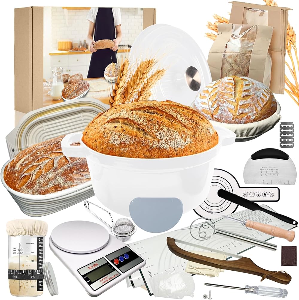 【All-in-one and comprehensive】: This is a complete sourdough baking kit that includes all kinds of tools needed for the whole process from making sourdough to baking bread. For example, there are 4 proofing baskets (2 made of silicone and 2 made of wood) with matching lids, an enamel pot with a lid, a silicone preparation mat, an accurate digital scale, a convenient baking sling, a practical bread slicer, a bread lame along with 5 extra blades and a leather pouch, etc.