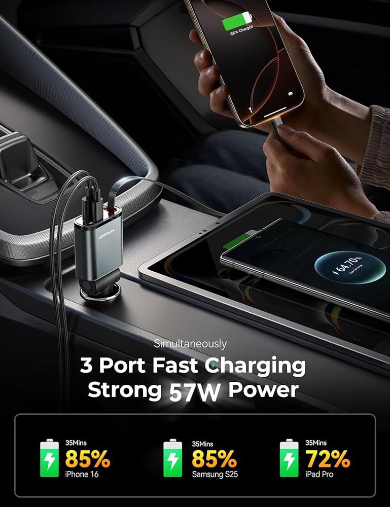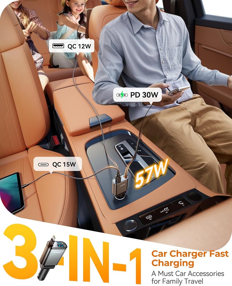 3-in-1 Retractable Car Charger - Ultra-slim 57W Retractable car charger with USB-C and USB [QC15W+QC12W] ports and multi-functional retractable cables [PD30W] for charging up to 3 devices at the same time. Ideal for fast charging the iPhone 16 Pro Max or other car gadgets, it's versatile enough for truck accessories or stylish car essentials. Whether you're looking for car accessories for men or women, that‘s a nice choice. Makes your car more neat and organized with this smart car organization solution. Smart car charger usb c efficient power distribution ensures full speed charge all your devices without slowing down the charging speed
