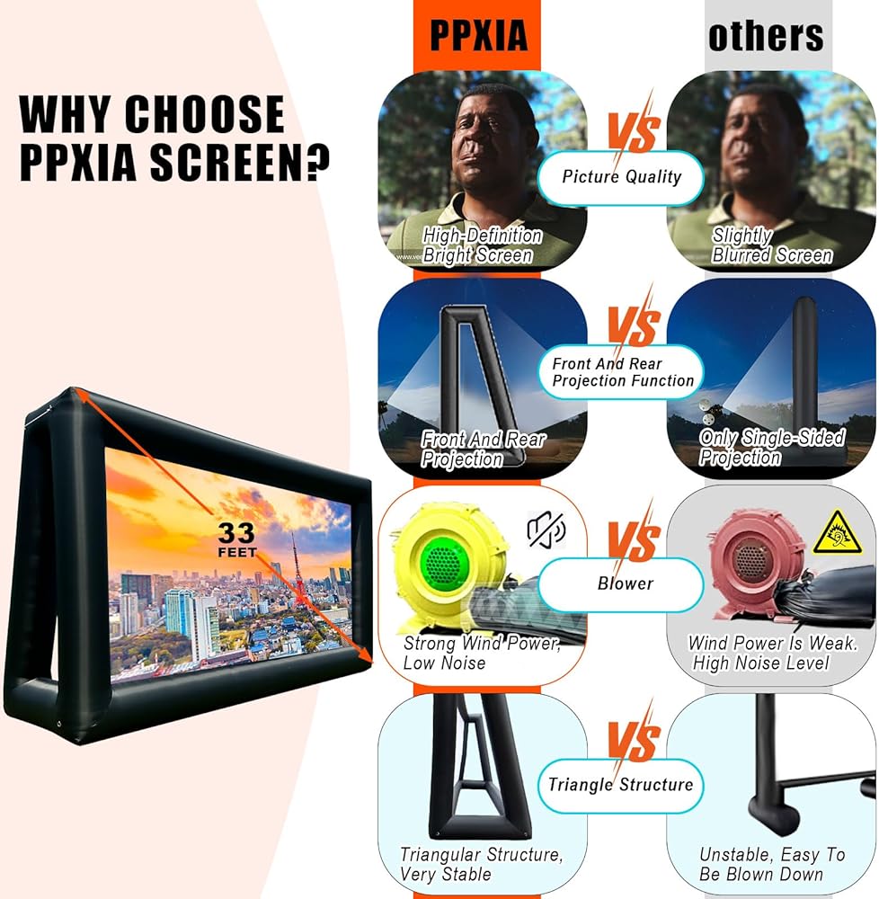 FRONT AND REAR VIEW SUPPORTED:The inflatable screen supports front and rear projection and can be freely set up as needed. PPXIA suggests that building an additional sound system and can better enjoy movies, games, music shows.
