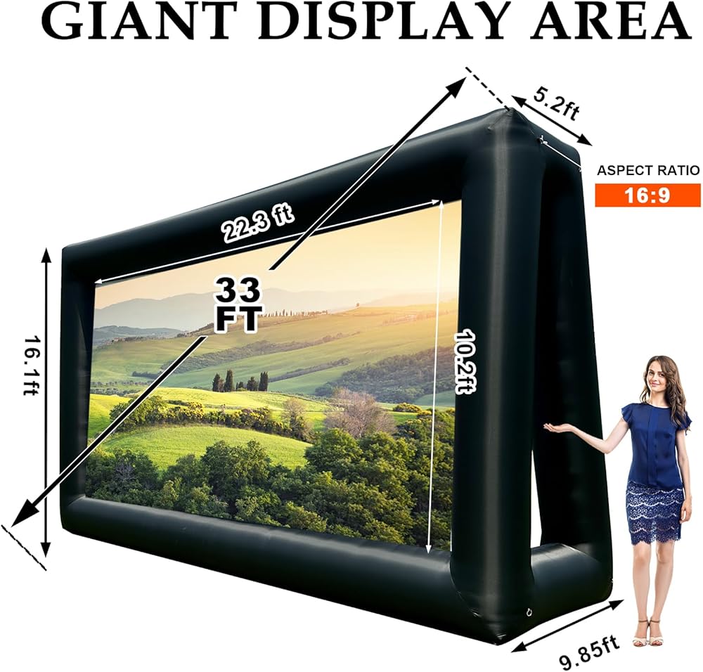 INFLATABLE PROJECTOR SCREEN FOR OUTSIDE:Decent size 16:9 aspect ratio and 160 viewing angle. Projectable size up to 8.6FT (Length) × 4.8FT (Height), which providing a 120inch viewing area. Move the movie theater into your backyard and have a great family time.