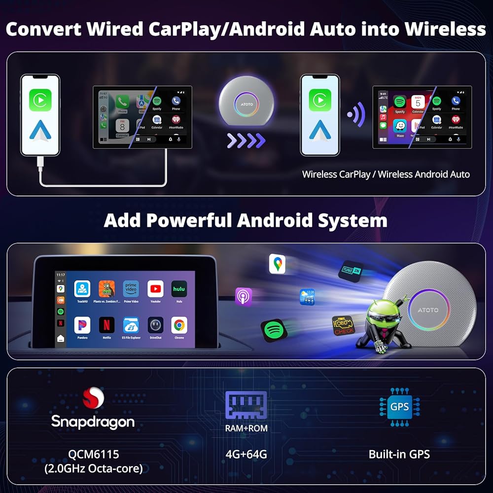 Upgrade to Wireless Connectivity: Transform your car's wired CarPlay or Android Auto into wireless with the CB6 Android Box, offering seamless wireless CarPlay and Android Auto experiences—even if your stereo originally supports only one of them