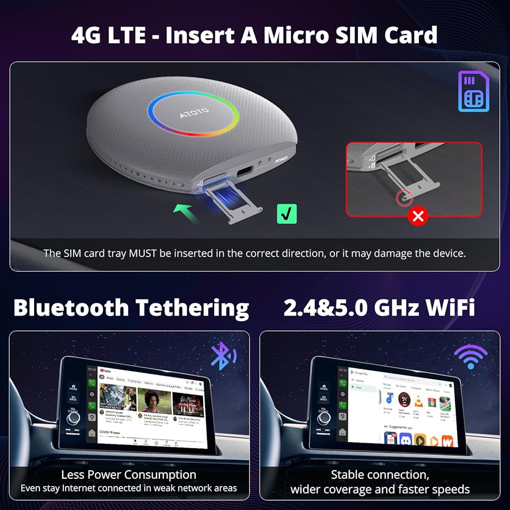 Note for WiFi Connection: When using wireless CarPlay or wireless Android Auto, please connect to the internet via the built-in 4G LTE, with Bluetooth 2 as an alternative. WiFi is NOT supported during wireless CarPlay or Android Auto use