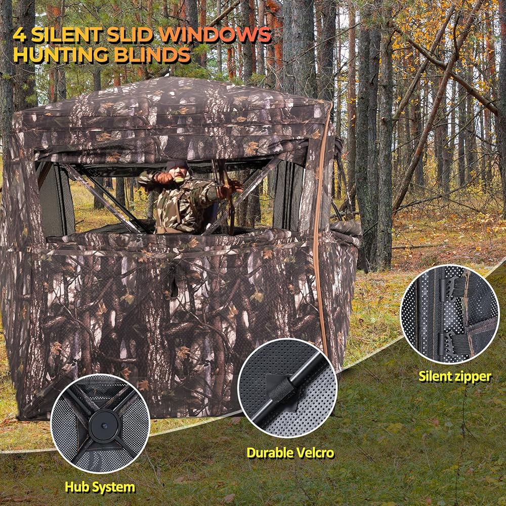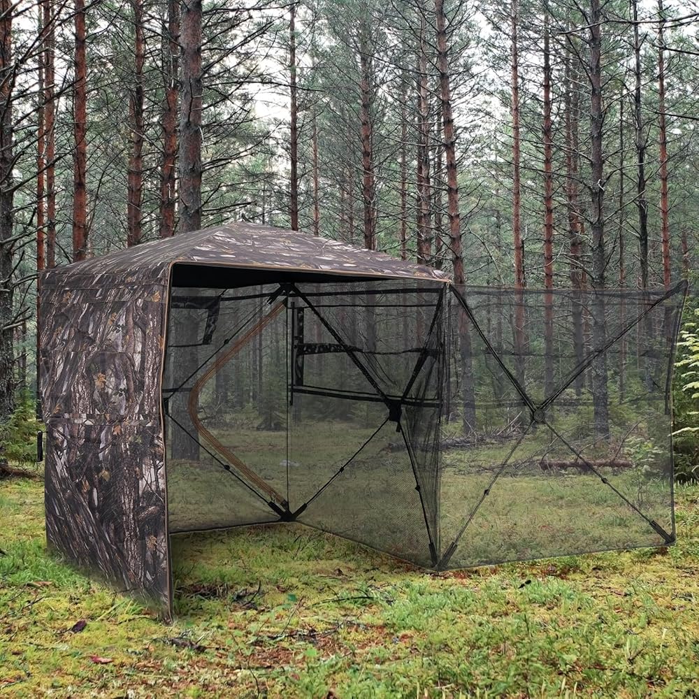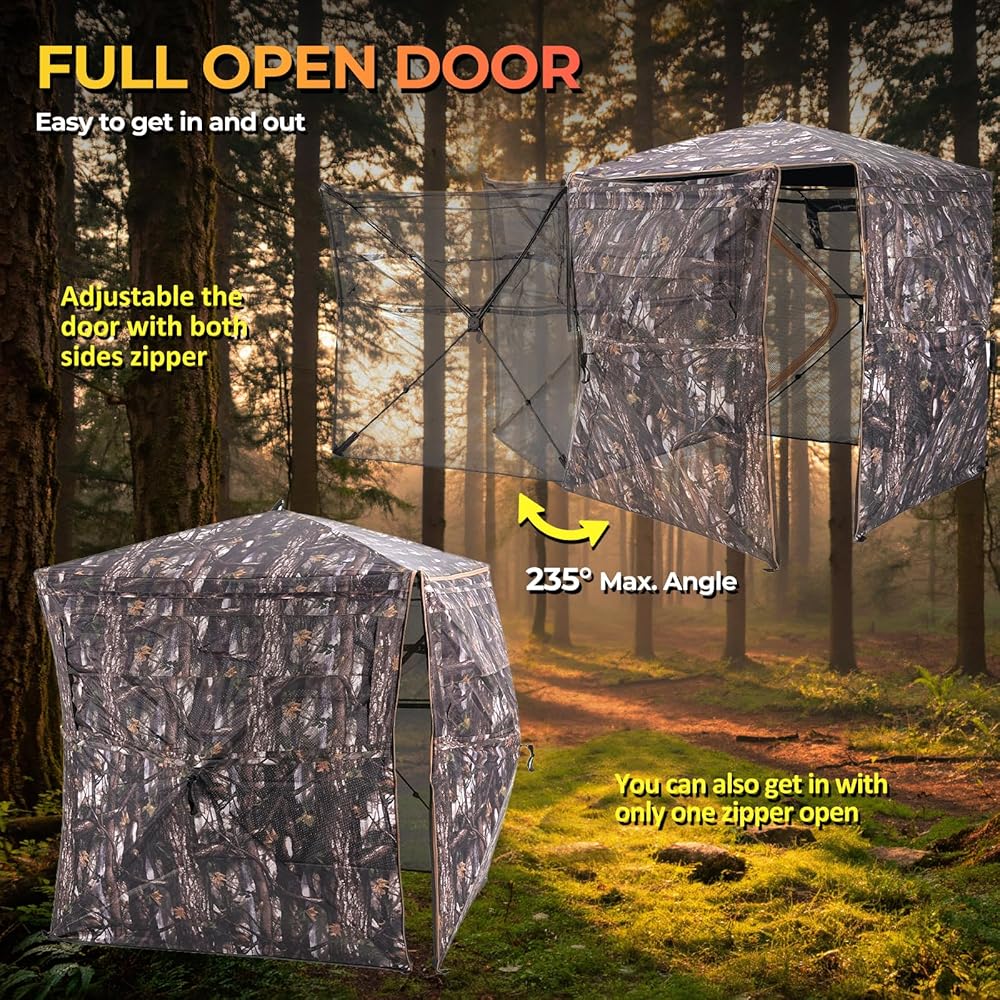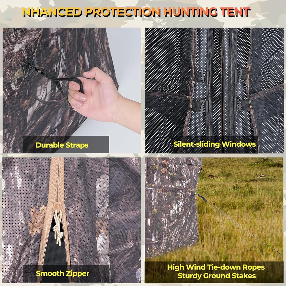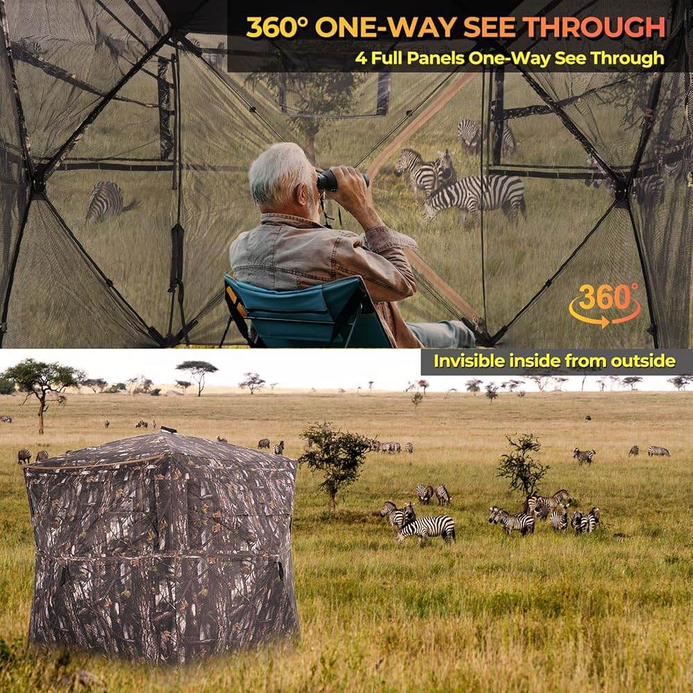 【Unique Stealth Design】: This hunting shelter uses fabric perforation technology to achieve 360° one-way perspective while maintaining excellent concealment and providing hunters with a great view. The transparent material is made of noiseless fabric and equipped with silent sliding windows to help you go undetected during hunting.