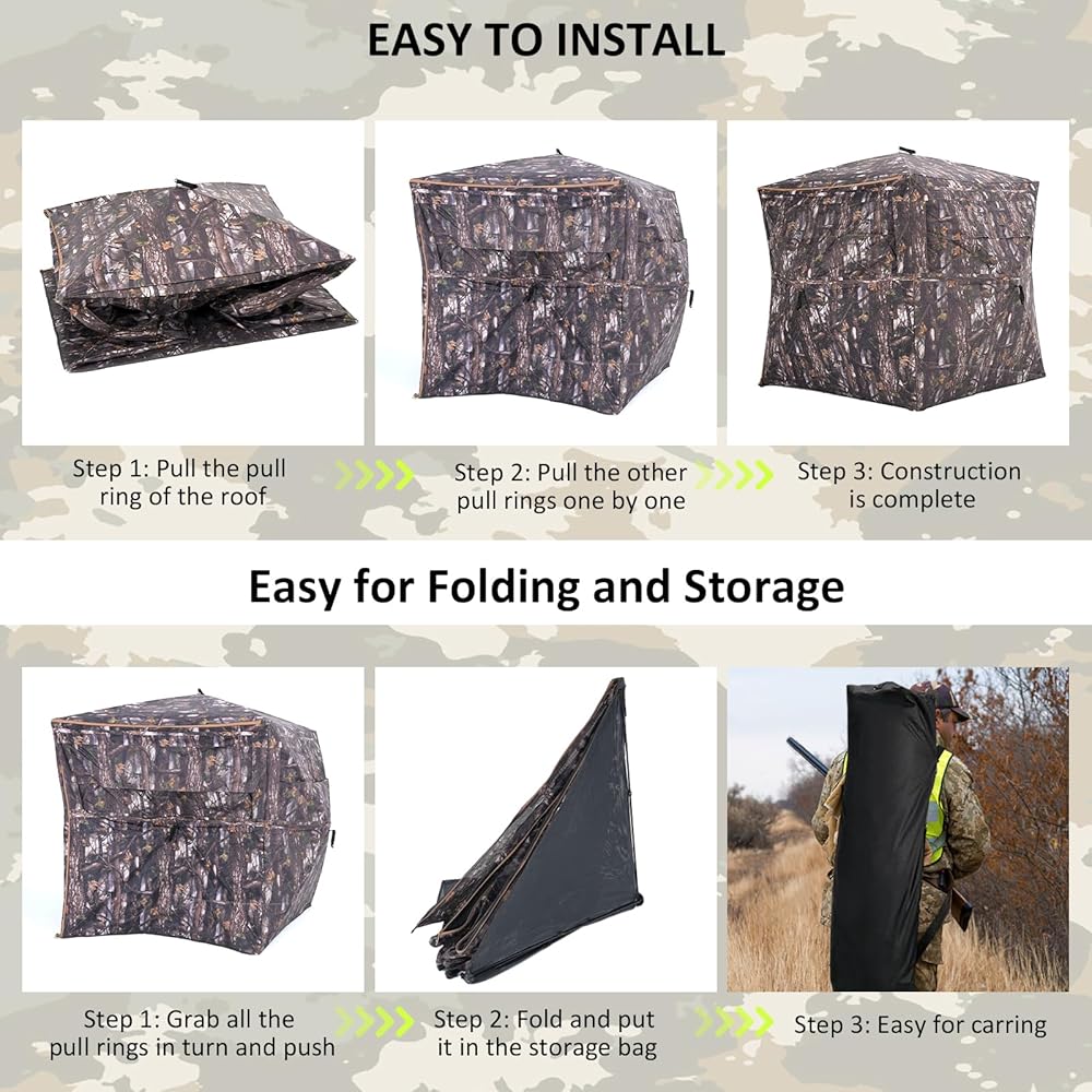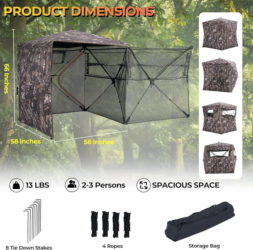 【Enough Space】: Dimensions: 66 inches high, 75 inches x 75 inches from hub to hub, and 58 inches x 58 inches of floor space. This hunting shelter can comfortably accommodate two to three hunters. There is also a large triangular zipper door for quiet and easy entry and exit.