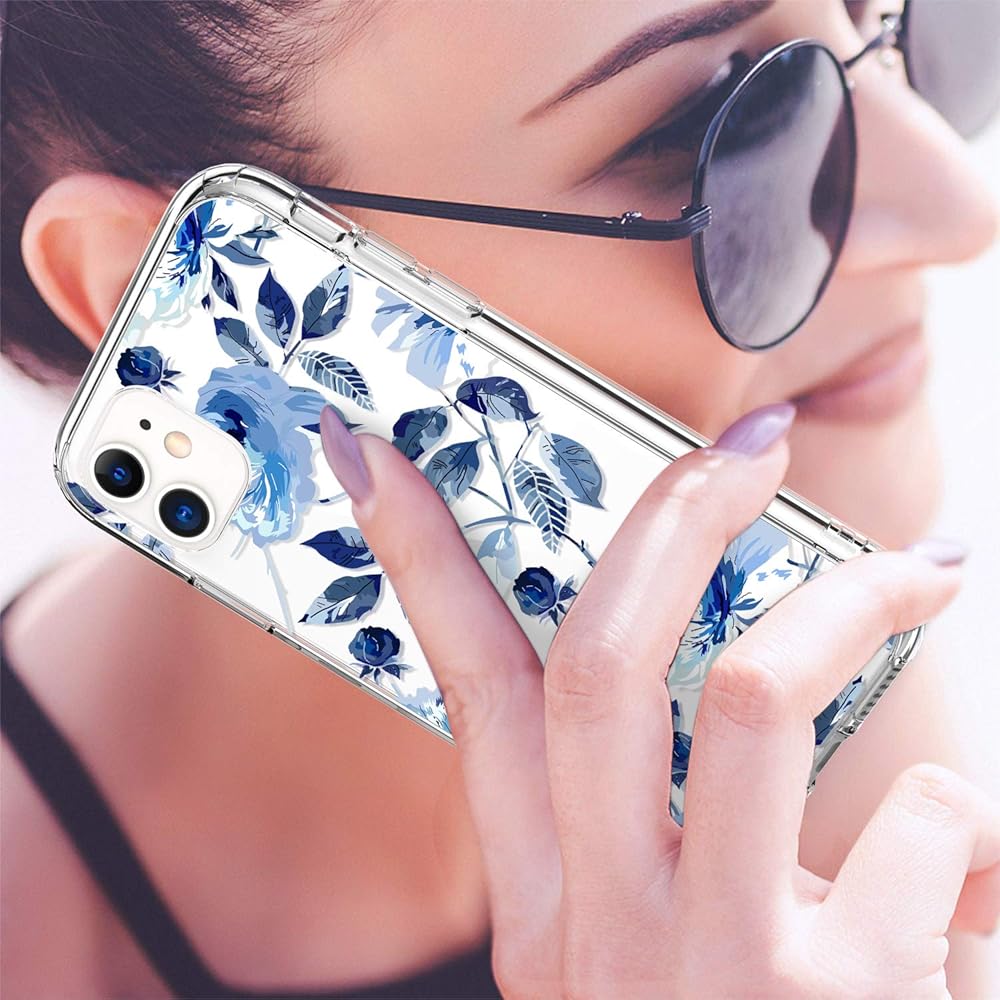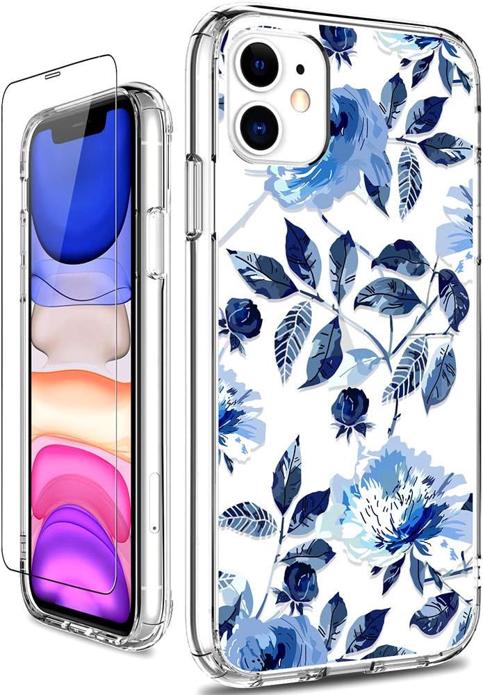 GiiKa for iPhone 11 Case with Screen Protector, Clear Heavy Duty Protective Case Floral Girls Women Shockproof Hard PC Back Case with Slim TPU Bumper Cover Phone Case for iPhone 11, Blue Flowers
