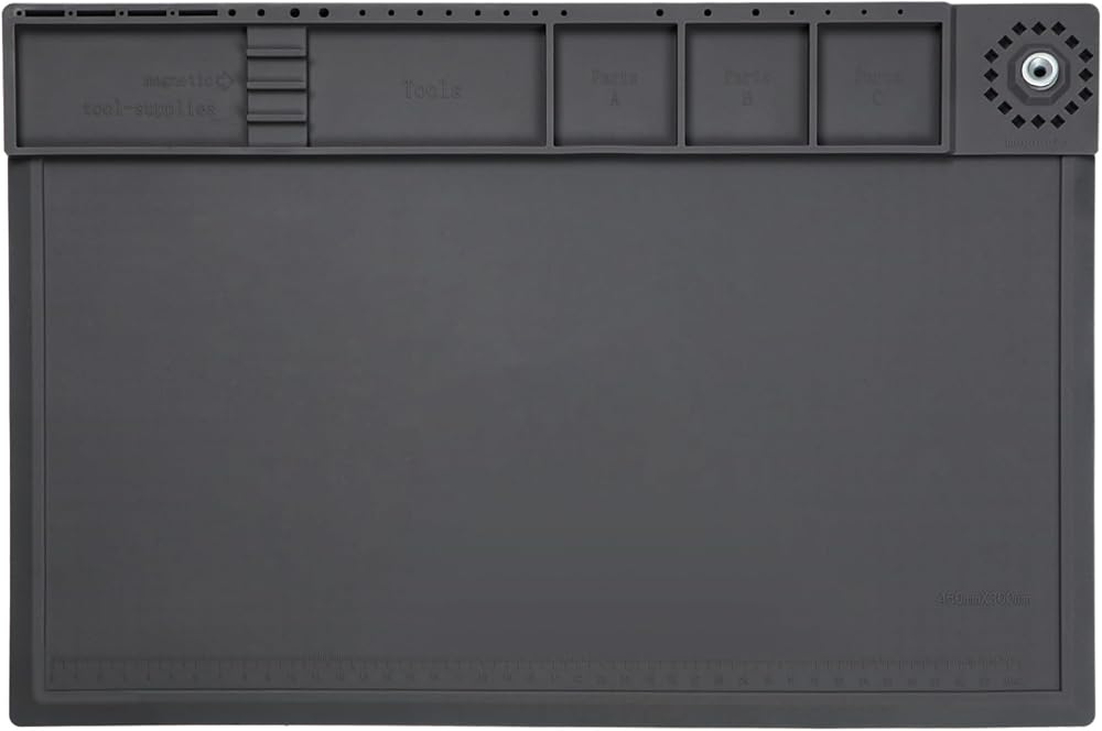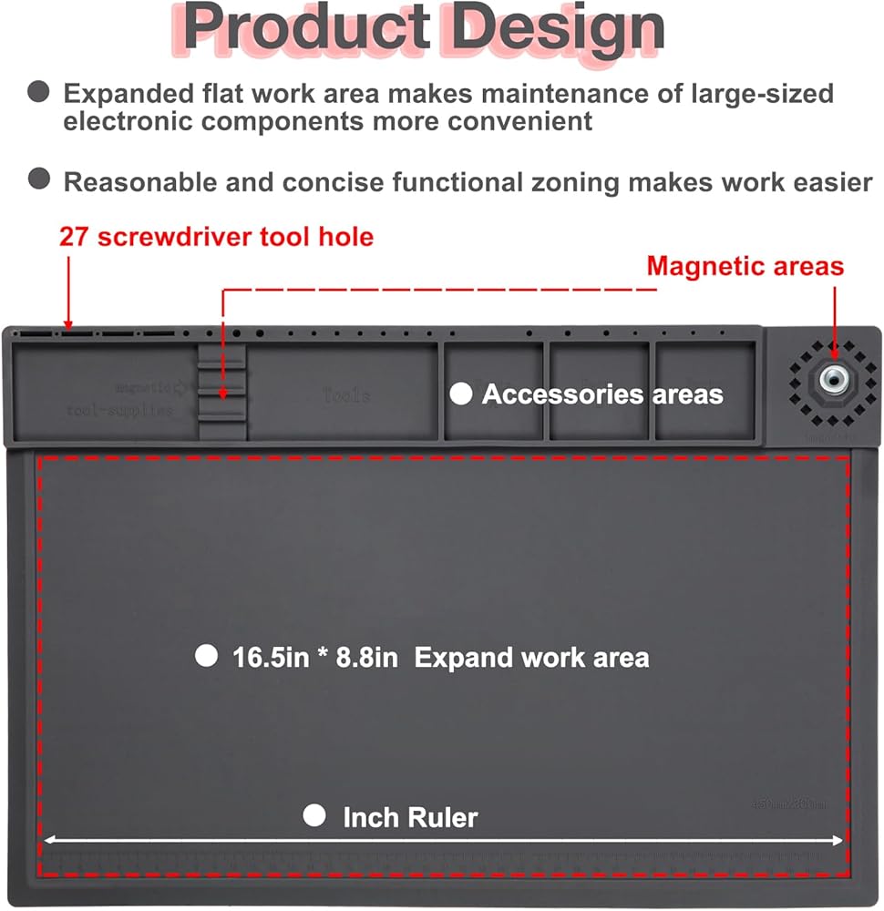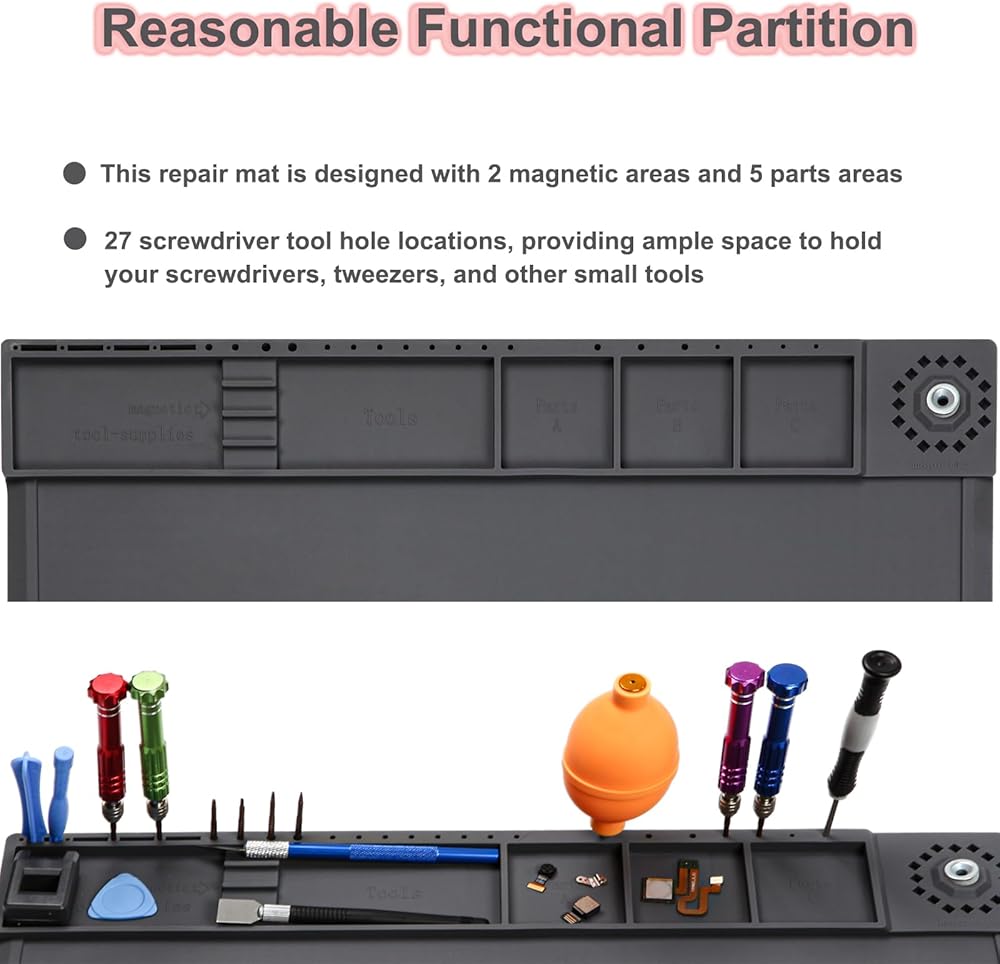 【Reasonable functional partition】 This repair mat is designed with 2 magnetic areas and 5 parts areas to help you classify and organize precision parts.The magnetic areas can securely hold screws, nuts, and other small metal parts, preventing them from rolling away or getting lost.This soldering mat features 27 screwdriver tool hole locations, providing ample space to hold your screwdrivers, tweezers, and other small tools.