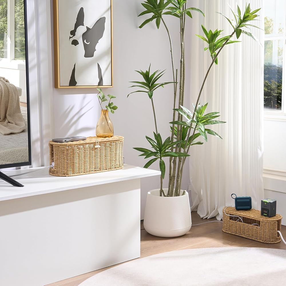 FairyHaus Cable Management Box 2Pack Caramel, Handwoven Large and Small Cable Organizer Box Cover to Hide Cords and Power Strip, Imitation Wicker Cord Organizer Box Hider for Office Desk and Floor