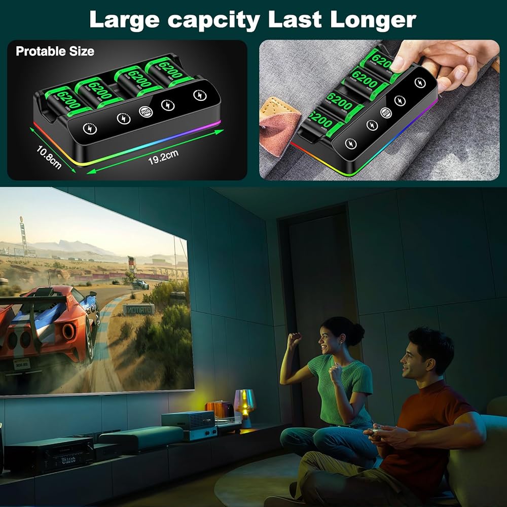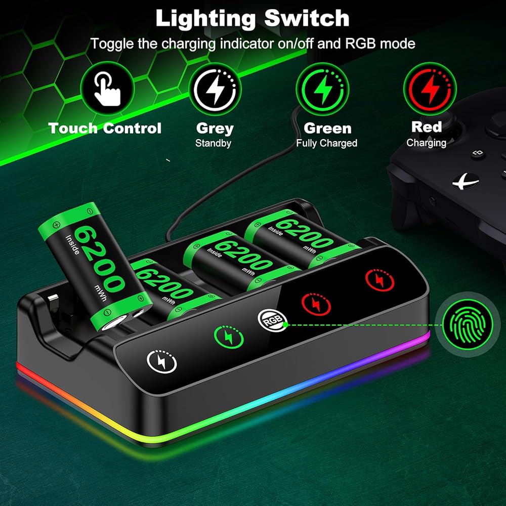 ◆ This portable Xbox One controller battery pack comes with 4 x 6200mAh rechargeable batteries and an RGB charging dock, which can be charged through a Type-C cable and placed anywhere. The 4 rechargeable batteries with chargers can provide sufficient power for your Xbox Series X|S/One S|X/One Elite controller, and these batteries are also compatible with the Xbox One / S / X / Elite / Xbox Series S / X controllers.