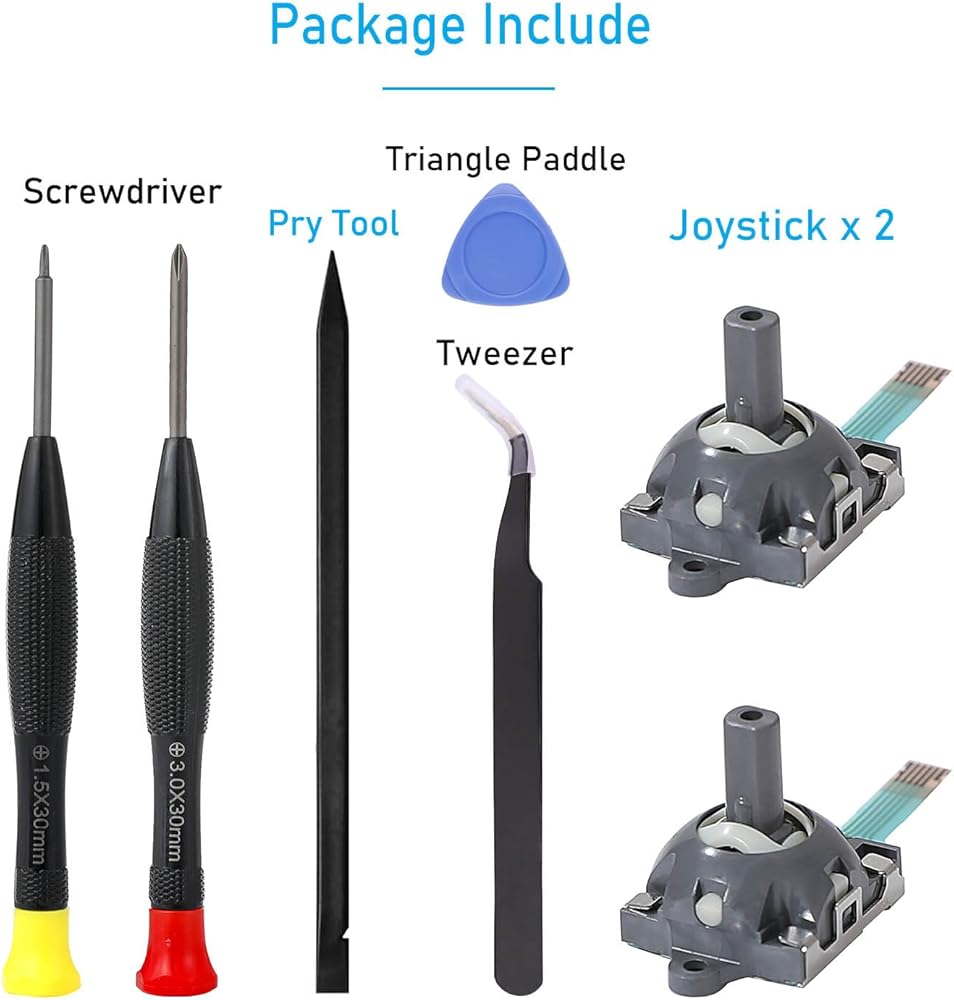 【What you get】Package include -- 2 x Joystick, 2 x Phillips Screwdriver, 1 x Metal Tweezer, 1 x Spudger, 1 x Metal Pry tool.