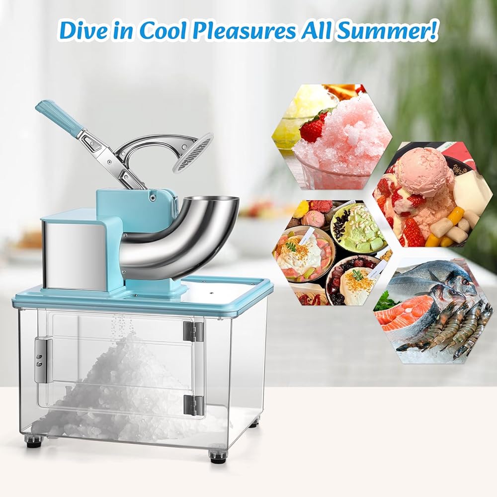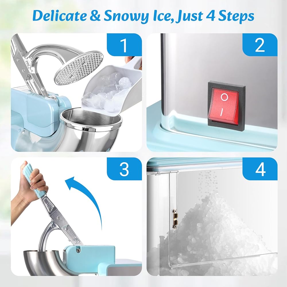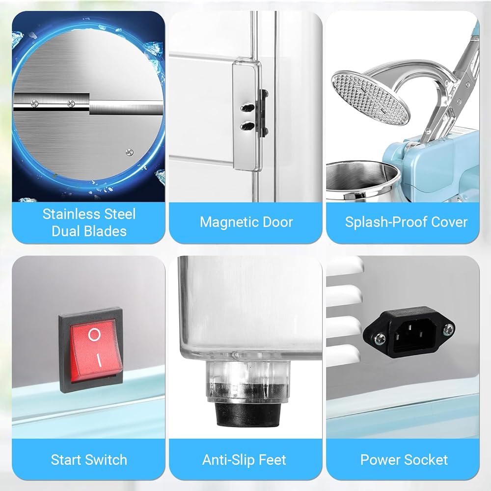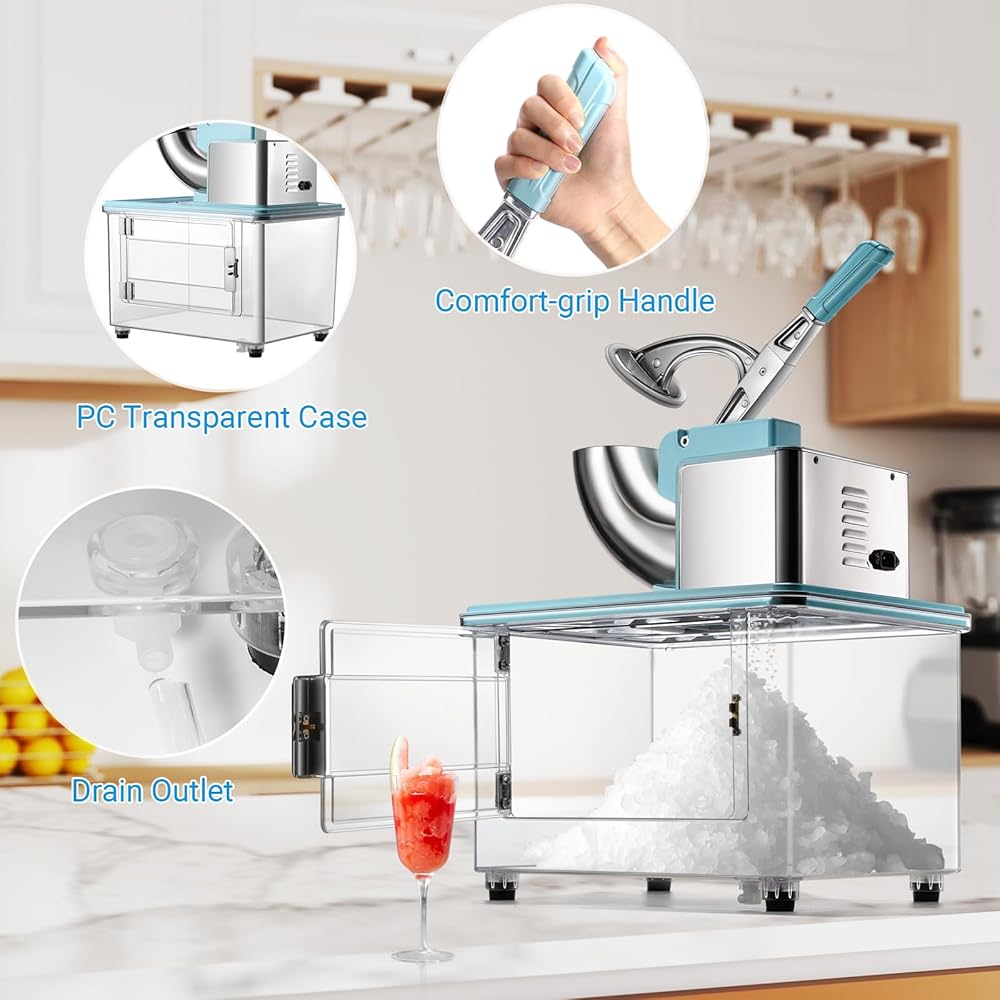 【Durable and Sturdy Build】This shaved ice machine is built with a durable stainless steel hopper and dual blades, a tough one-piece PC transparent container, and non-slip feet for adding stability