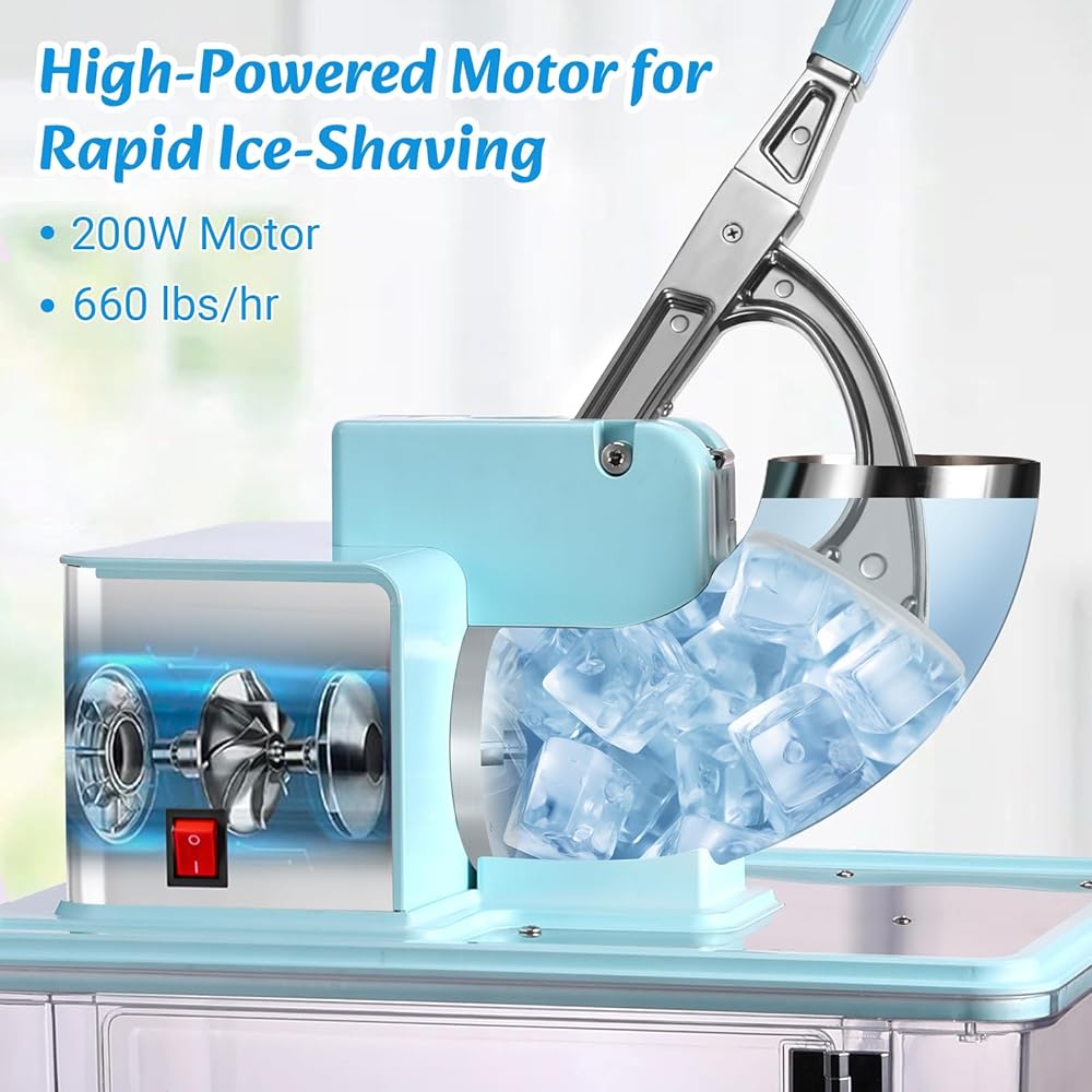 【Powerful Dual Blades for Efficiency】Featuring heavy-duty stainless steel dual blades and a powerful 200W copper motor, this ice shaver crushes ice quickly and efficiently—producing up to 660 lbs per hour for both home and business use