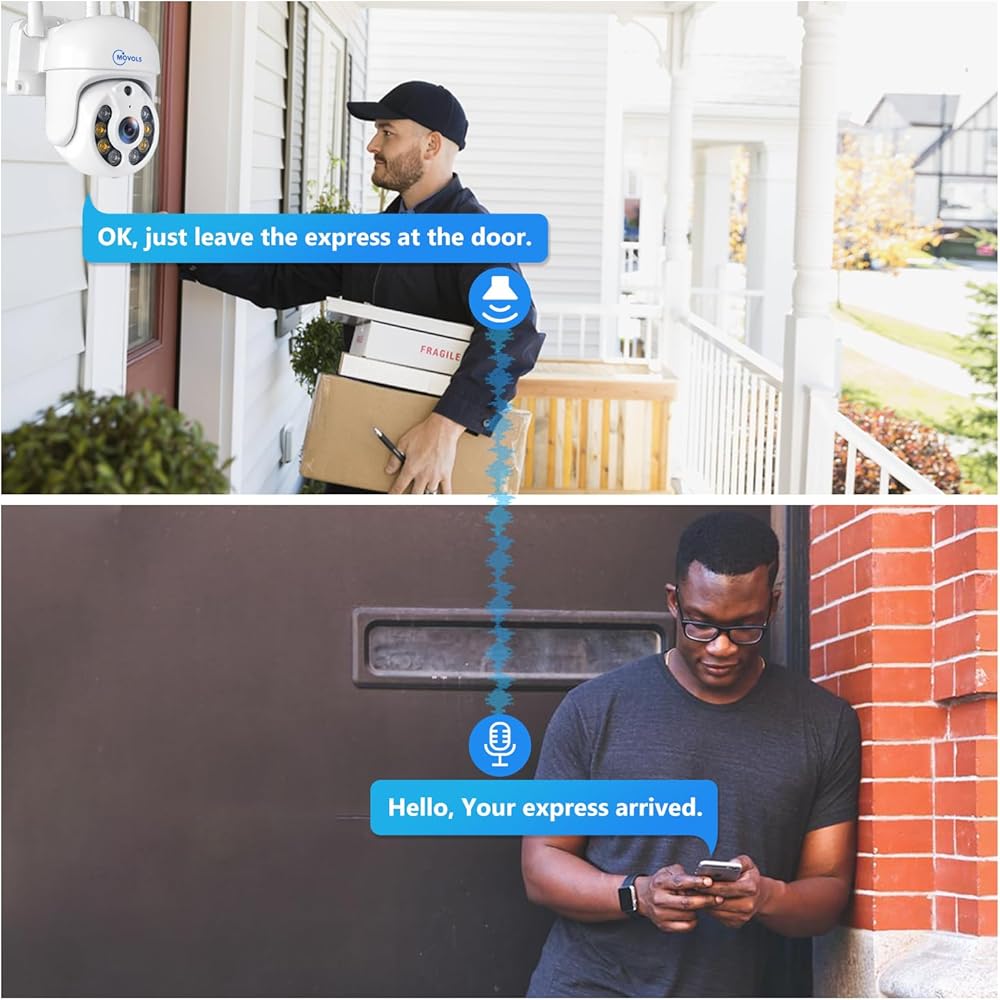 【AI Human Detection & Auto Tracking & Night Vision & 2 Way Audio】Featuring with humanoid detection, minimizing unwanted alerts such as animals or shadows.Once detect a person, camera will automatically track and sound to warn the Intruder, activate floodlight, you will receive instant alerts.It offer infrared B/W night vision,Full colorful night vision and Smart mode.Built-in noise reduction microphone and speakers which provides 2 way high-fidelity conversation all the time.